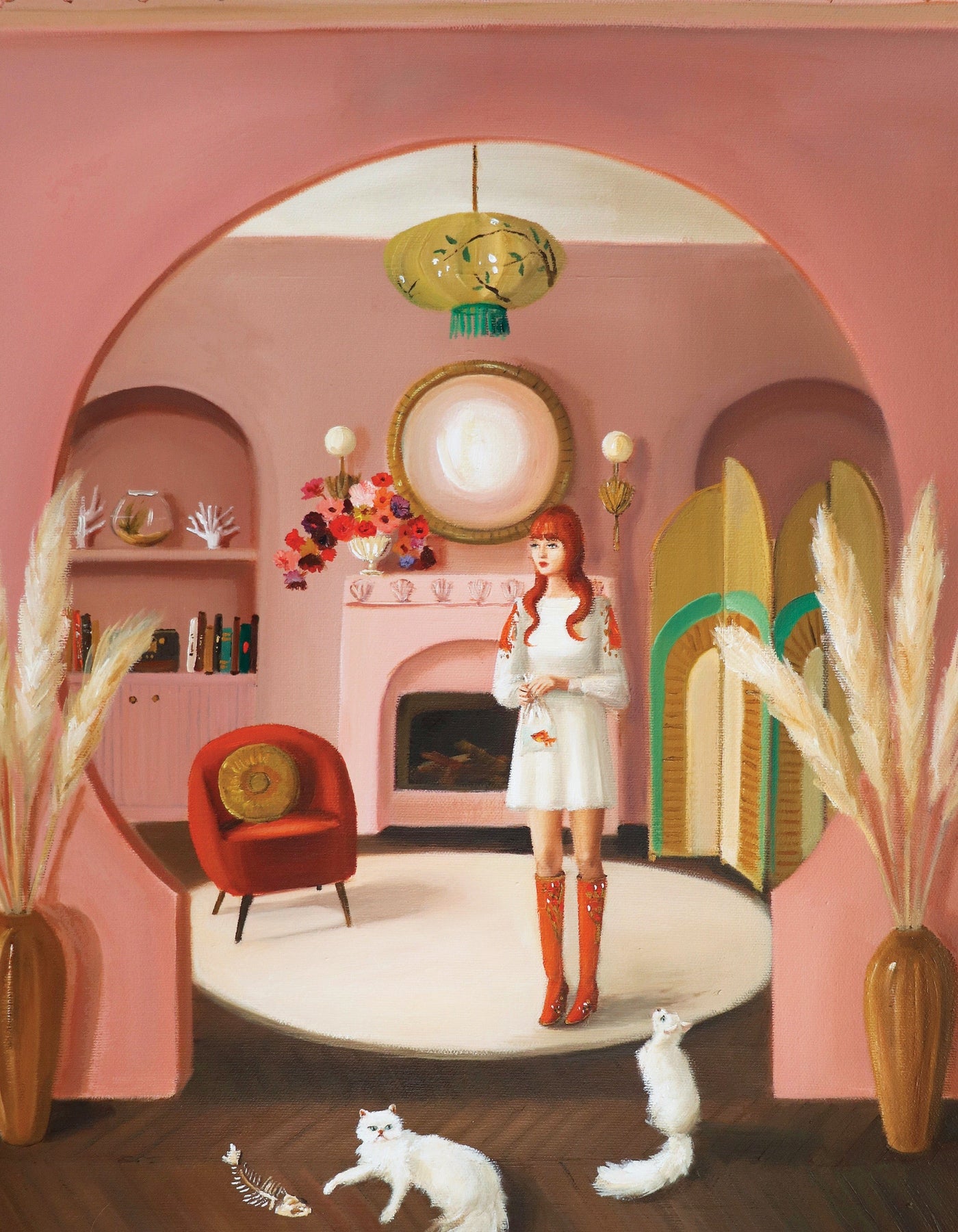 A pair of mischievous cats awaits their next meal from the goldfish bowl.