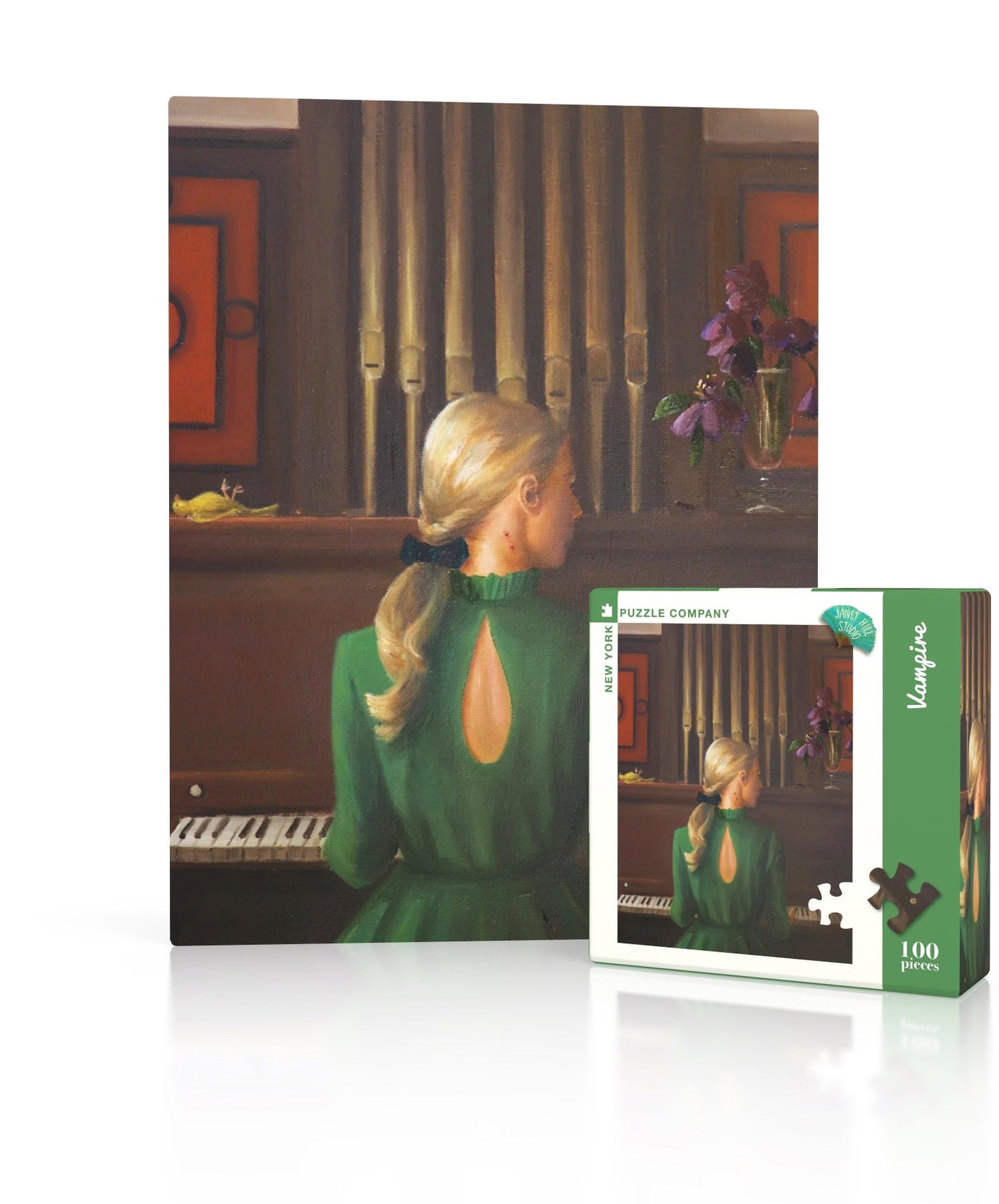 Vampire fangs adorn the neck of a mysterious woman playing the piano.