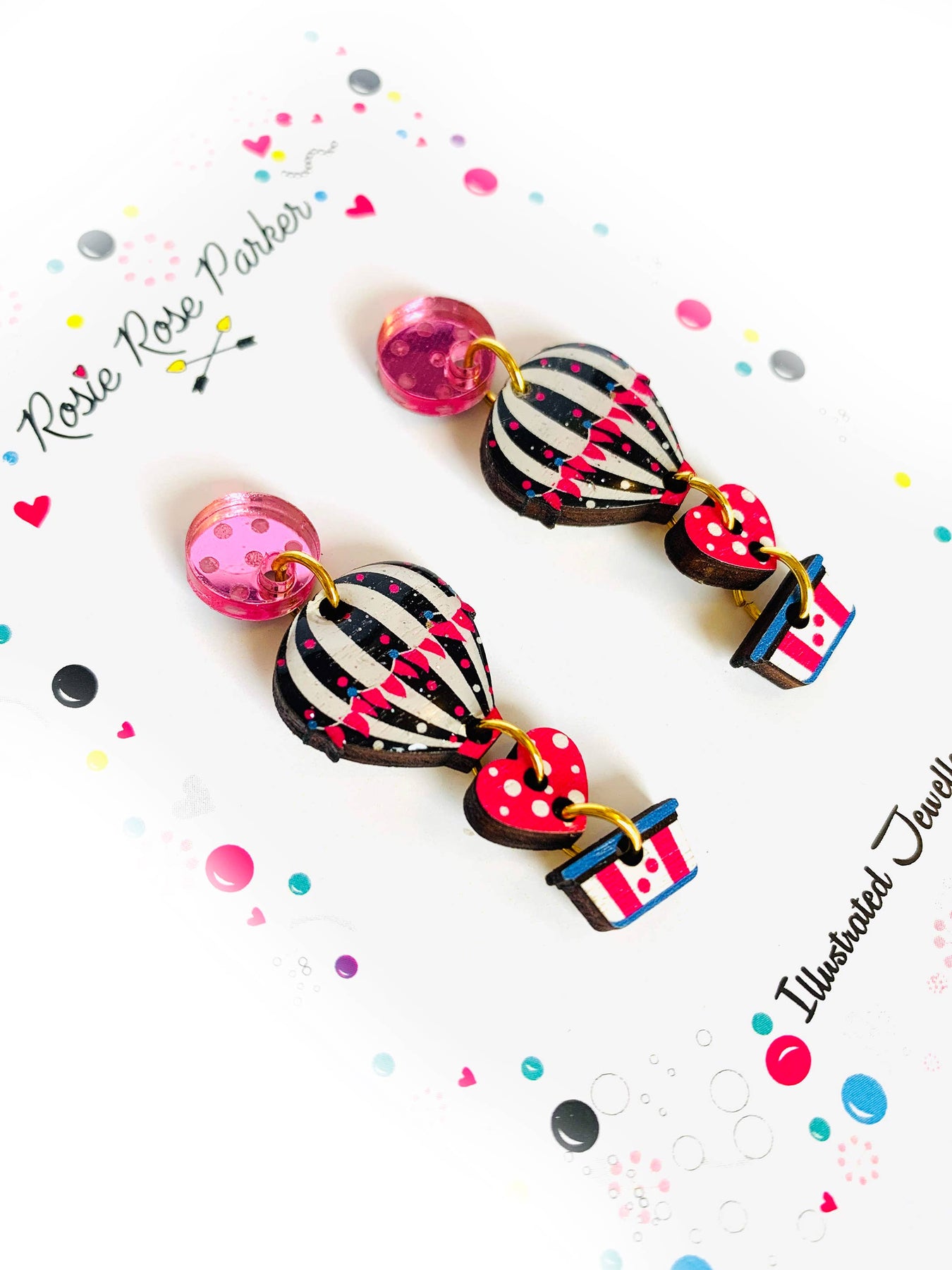 Add a touch of whimsy and fun to your outfit with these Heart Air Balloon Earrings by Rosie Rose Parker. These spectacular earrings feature a drop air balloon design in bright pink, perfect for summer. Handmade with wood and resin, they are also hypoallergenic, making them a must-have for all earring lovers.