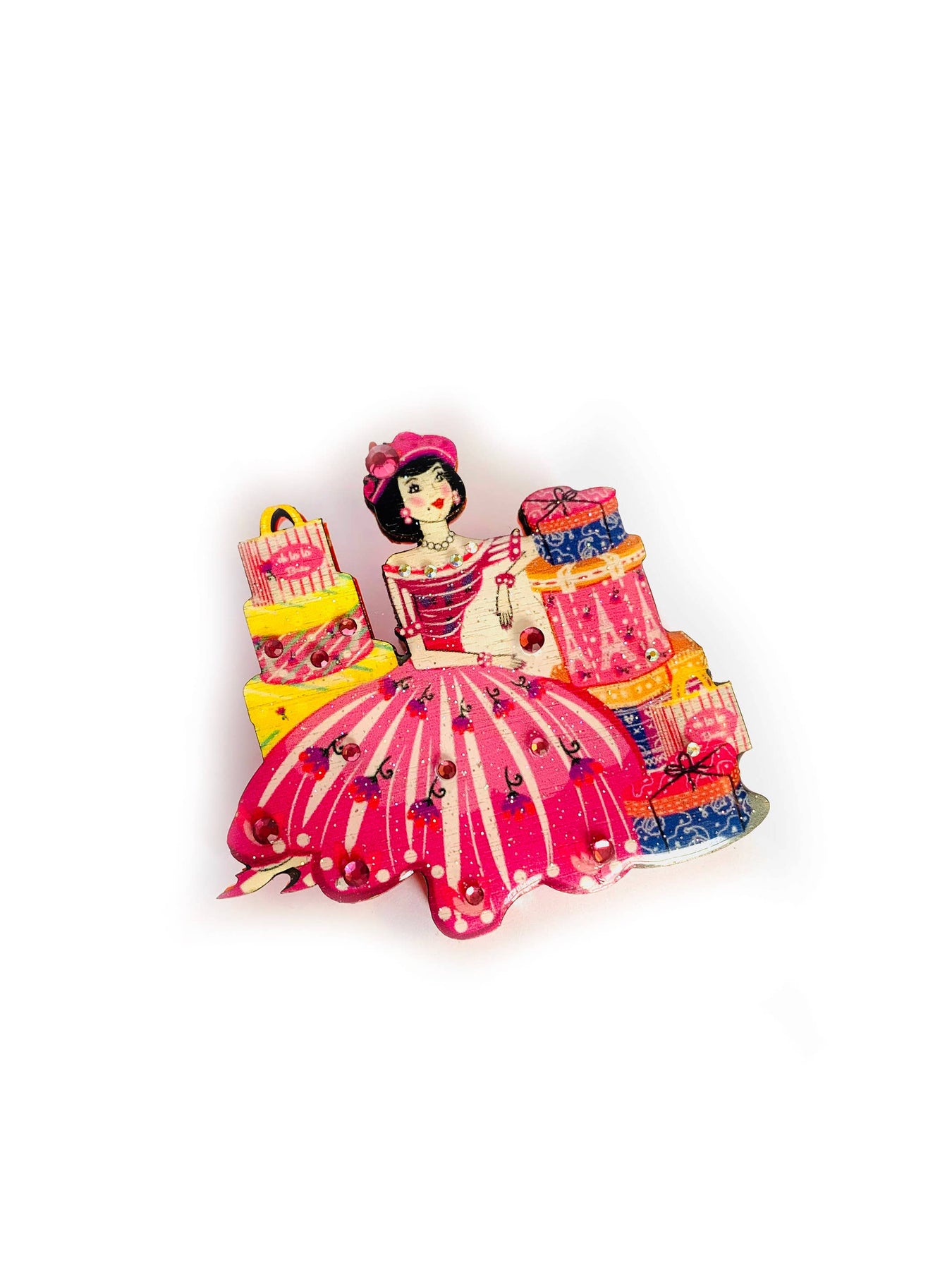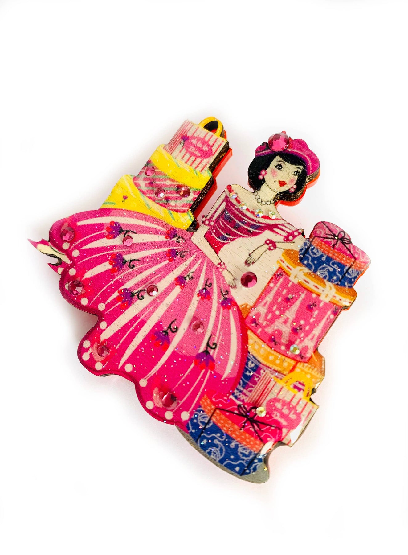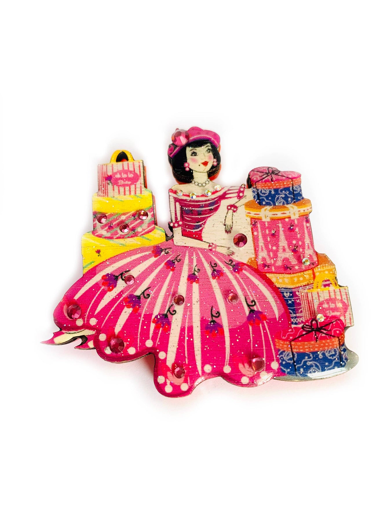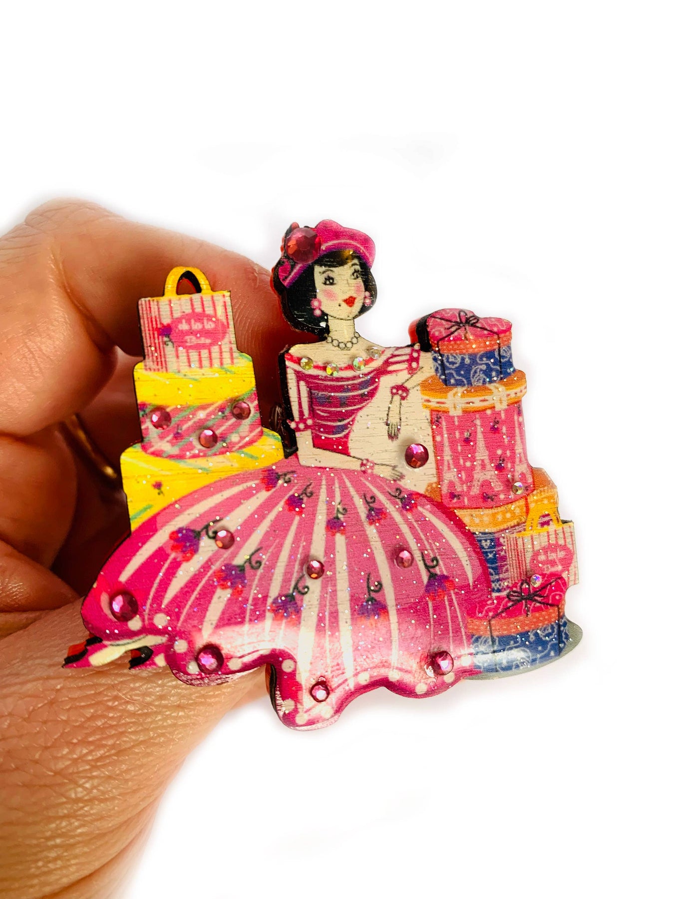 Indulge in Parisian style with Rosie Parker's 'Lets go shopping in Paris' brooch. This quirky and glamorous statement piece features a hand-illustrated Juliette, dressed in a French dress and umbrella, adorned with gems and glitter. With a stainless steel back and double woods and resin, this brooch is truly unique and oh la la-worthy!