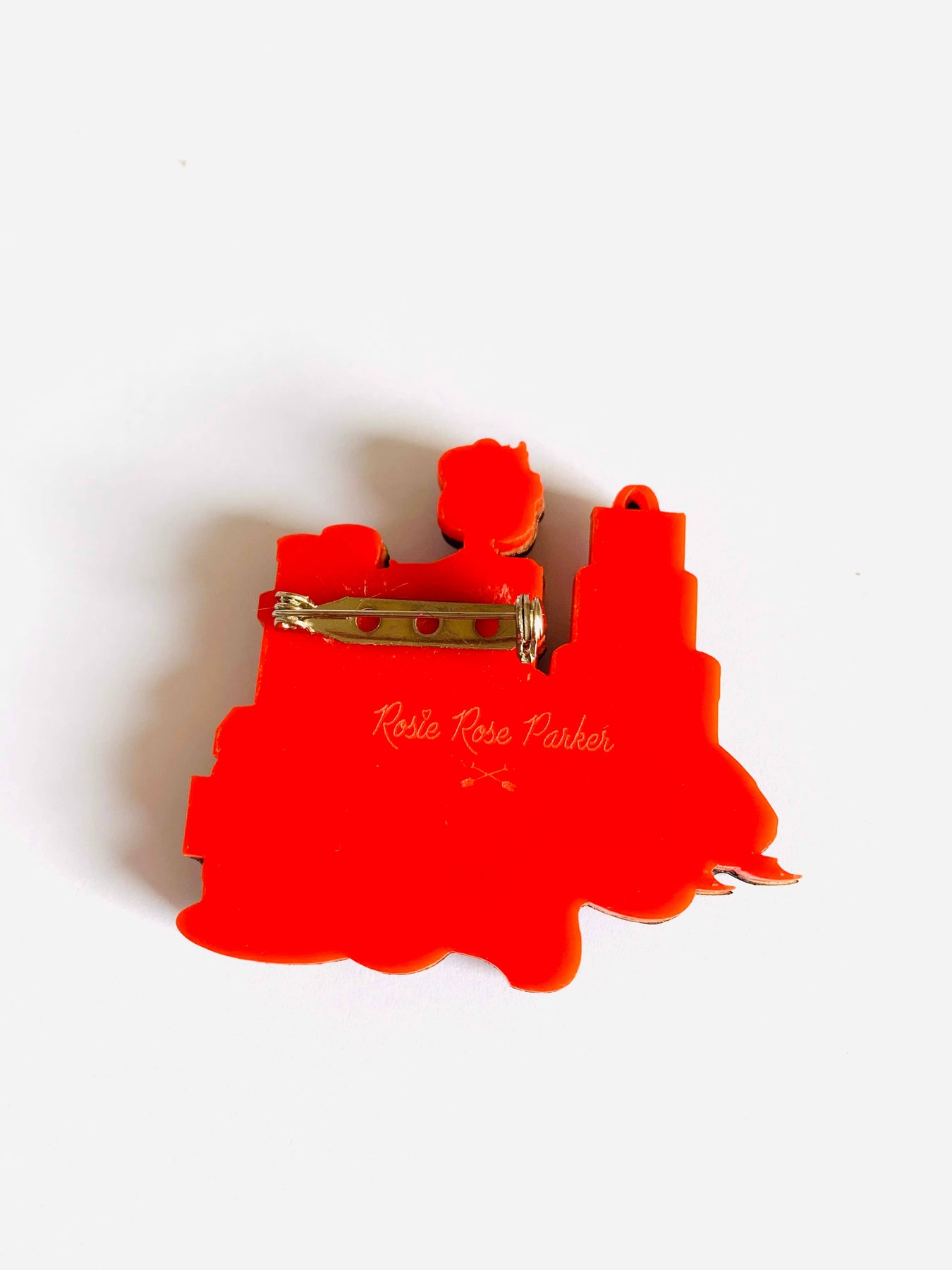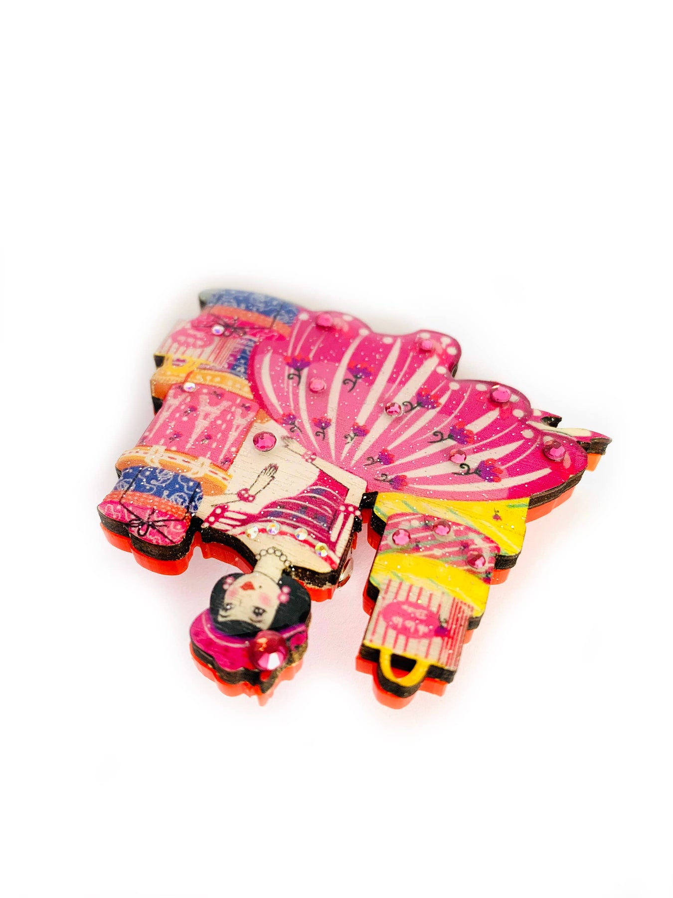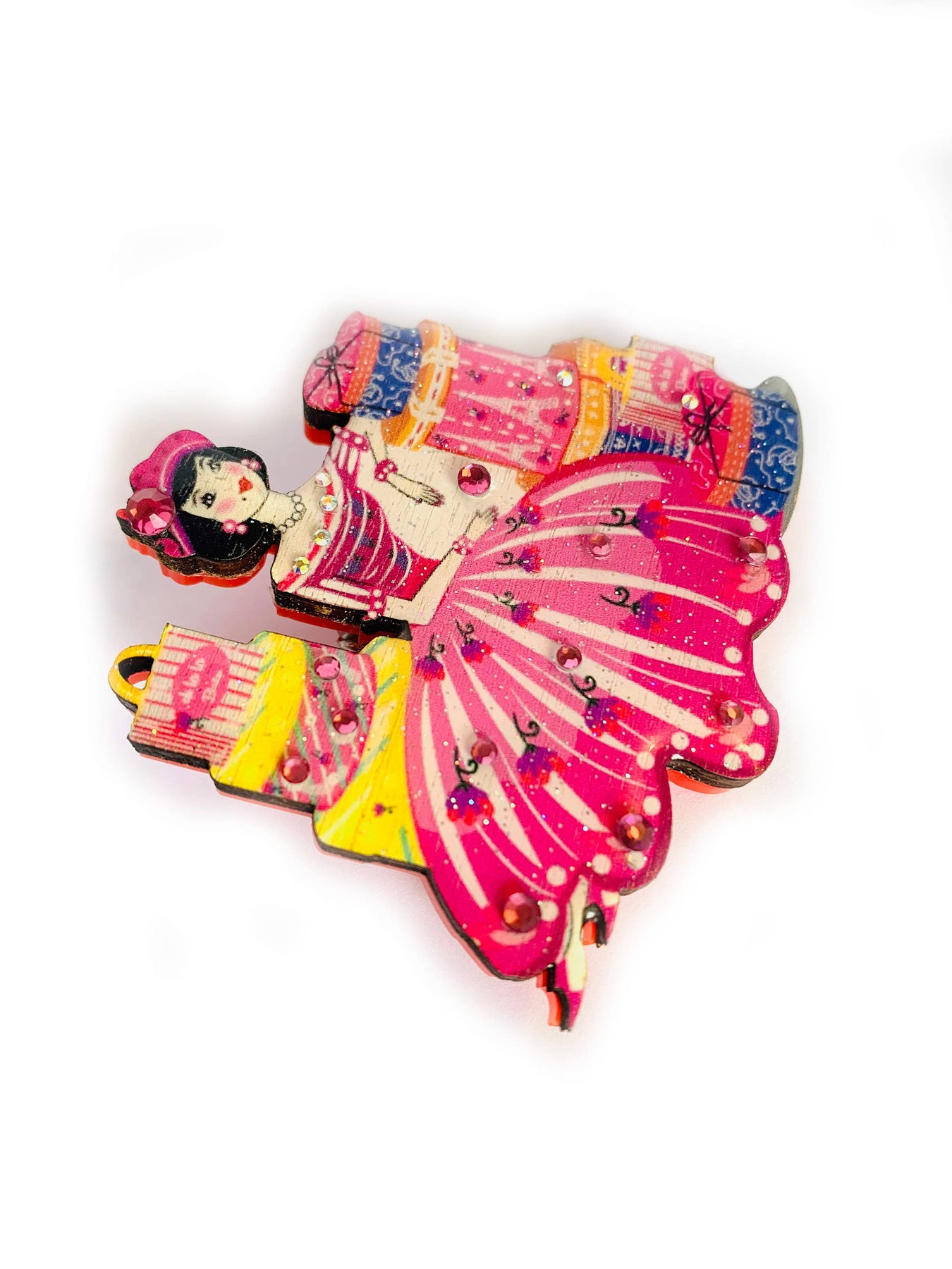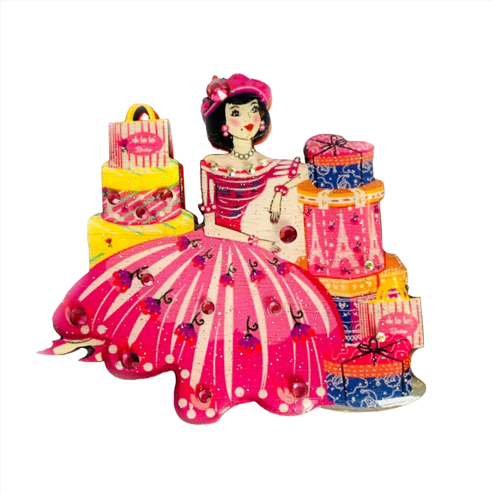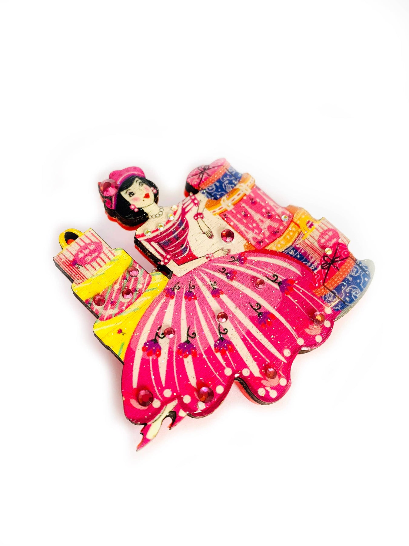 Indulge in Parisian style with Rosie Parker's 'Lets go shopping in Paris' brooch. This quirky and glamorous statement piece features a hand-illustrated Juliette, dressed in a French dress and umbrella, adorned with gems and glitter. With a stainless steel back and double woods and resin, this brooch is truly unique and oh la la-worthy!