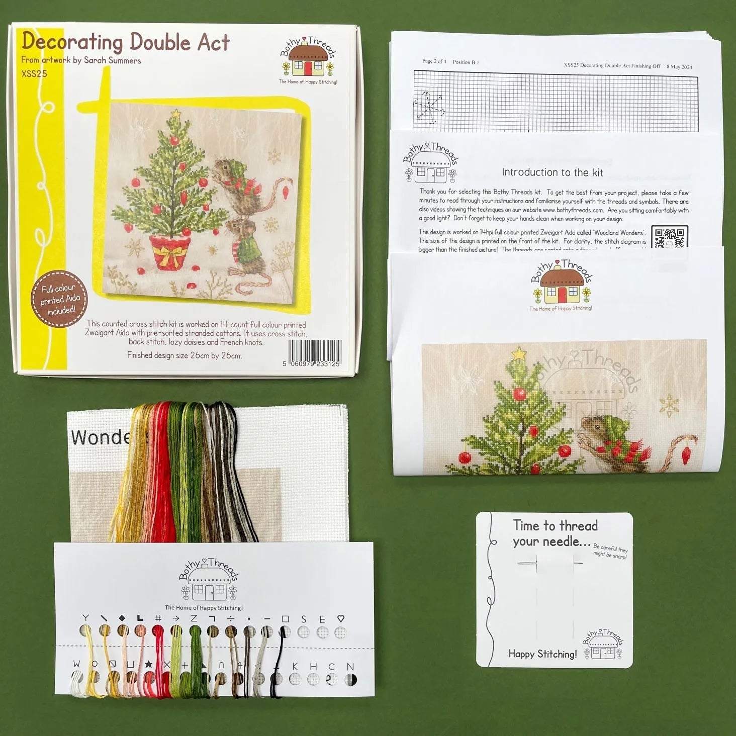 This counted cross stitch kit is worked on 14 count Zweigart Aida which has been printed with an exclusive woodland background . The design uses cross stitch, back stitch, lazy daisies and French knots. The kit includes pre-sorted stranded cottons, a needle and a clear stitch diagram and instructions. The finished design size is 26cm by 26cm. This design is based on original artwork by Sarah Summers. Dimensions 10,24 x 10,24 inches