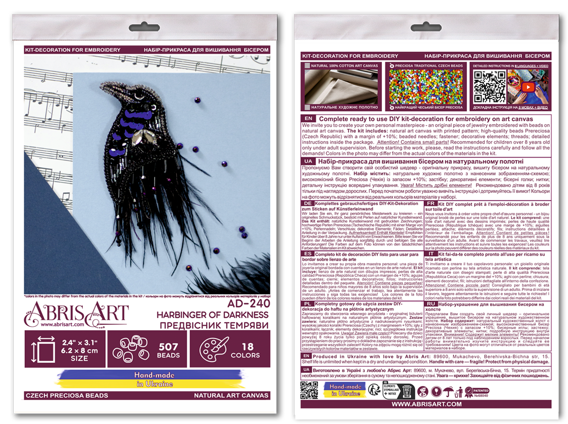 In each carefully assembled box Decoration Harbinger of Darkness (Decoration) after purchase and delivery you will find: a large piece of natural art canvas with a printed image-scheme (fabric for embroidery) larger than the size of the picture - 80 x 62 mm. - with enough stock to make it convenient to embroider and design the finished picture! The world's best beads Preciosa Ornela (Czech Republic), with "stock" - more than 507 beads, high-quality bead needles from Japan , and most importantly - detailed instructions, the scheme for beadwork with a key, specially developed by our designers for each plot separately and already applied to the canvas!