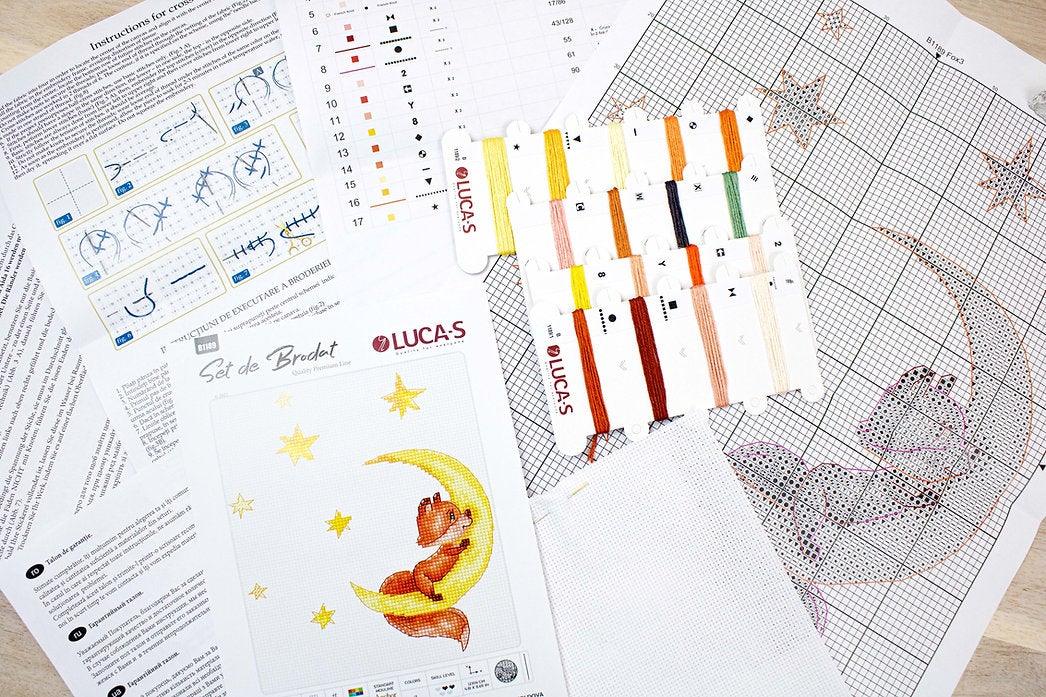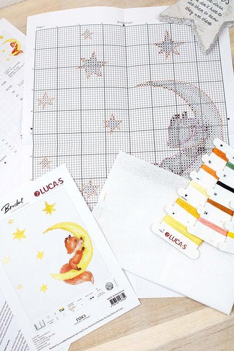Ginger Fox with a moon and stars. Sampler Cross Stitch kit from Luca-s. Series of 3 images. This cross stitch kit is counted and pattern is not printed.
