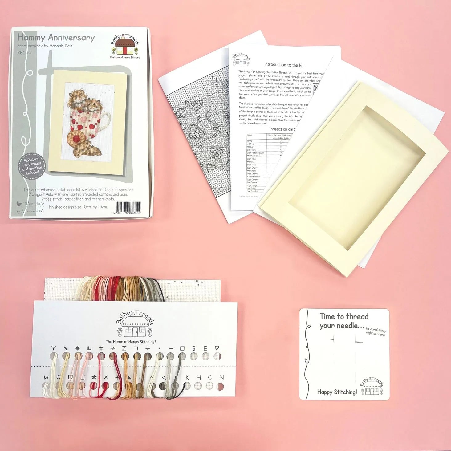 This counted cross stitch card kit is worked on 16 count white Zweigart Aida which has been printed with our exclusive Wrendale Designs brown speckle background. This design uses cross stitch, fractionals, back stitch and French knots. The kit also includes pre-sorted stranded cottons, a needle, an alphabet to personalise your design, a cream card and envelope, and a clear stitch diagram and instructions. The finished design size is 10cm by 16cm. This design is based original artwork by Hannah Dale of Wrendale Designs. Dimensions 3,94 x 6,3 inches