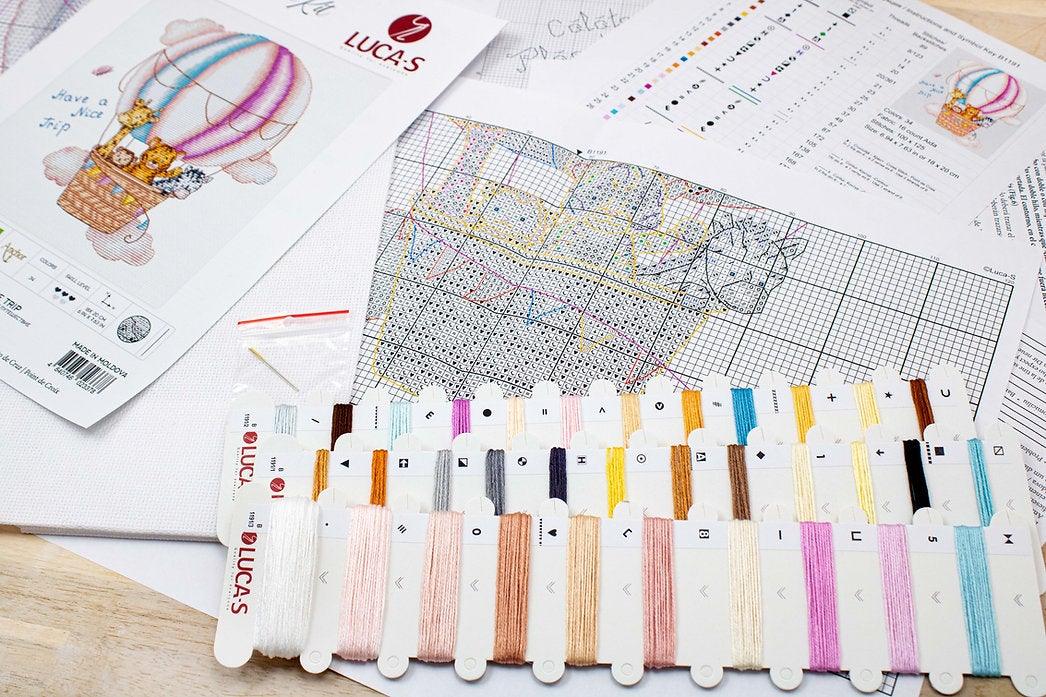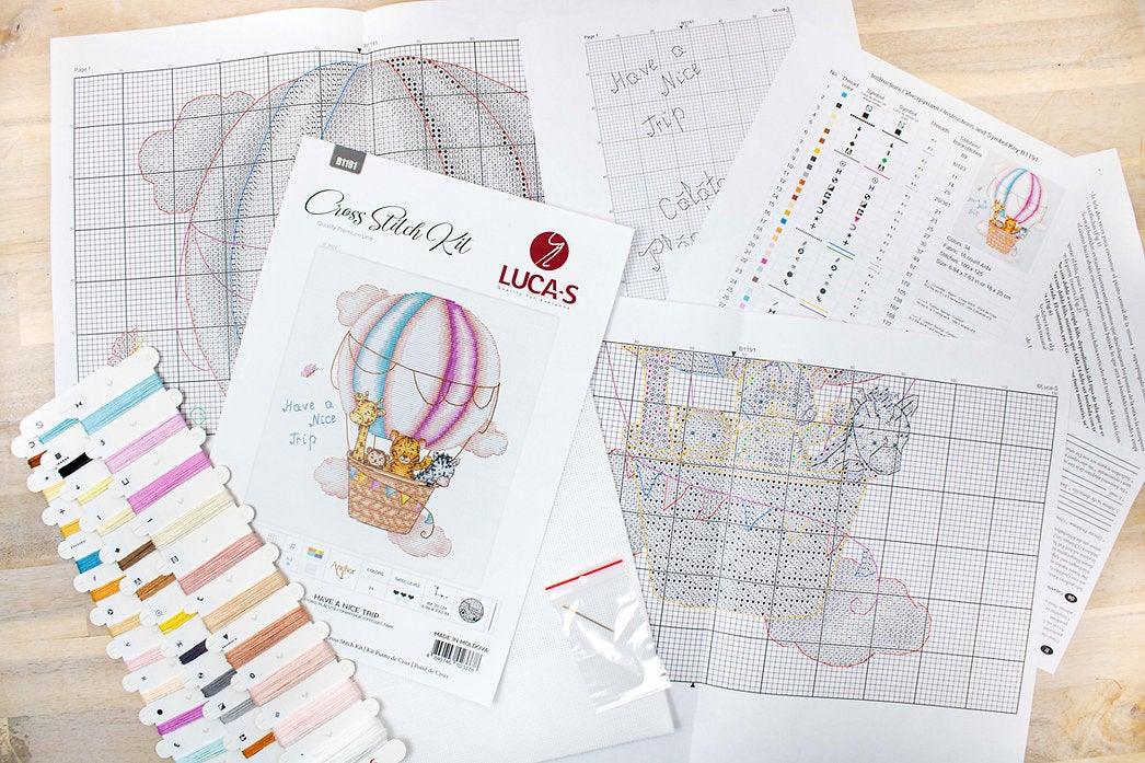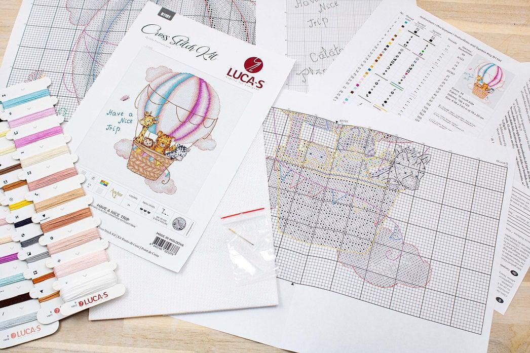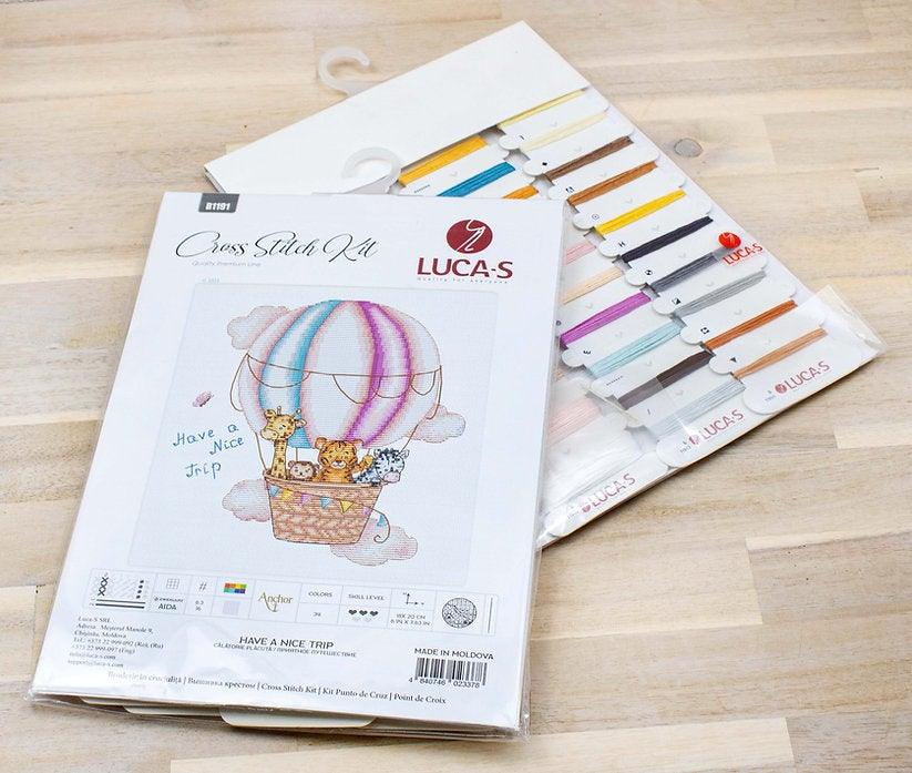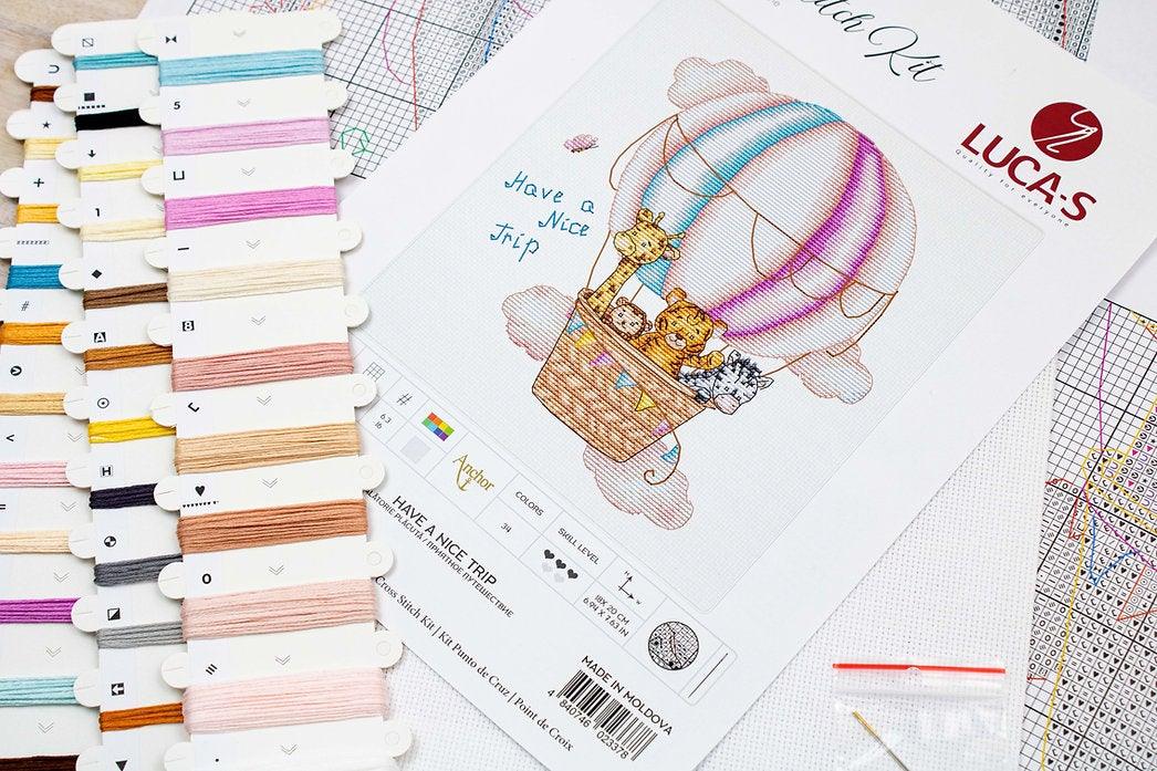 Cross Stitch this beautiful cross stitch kit for your baby's room. This soft and tender design featured cartoon elephant, giraffe, tiger and zebra. Animals are traveling on air balloon. This includes high quality Zweigart fabric and Luca-s threads. Background is not stitched for this sampler. This kit can be framed into nice white rustic frame.