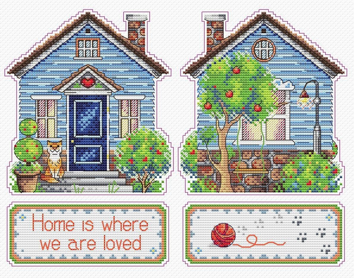 MP Studia counted cross-stitch set. This kit is stitched on the both sides with threads. Cross-Stitch base is plastic canvas. Cotton threads. It is new, unopened kit. Makes blue house on plastic with 2 sides.