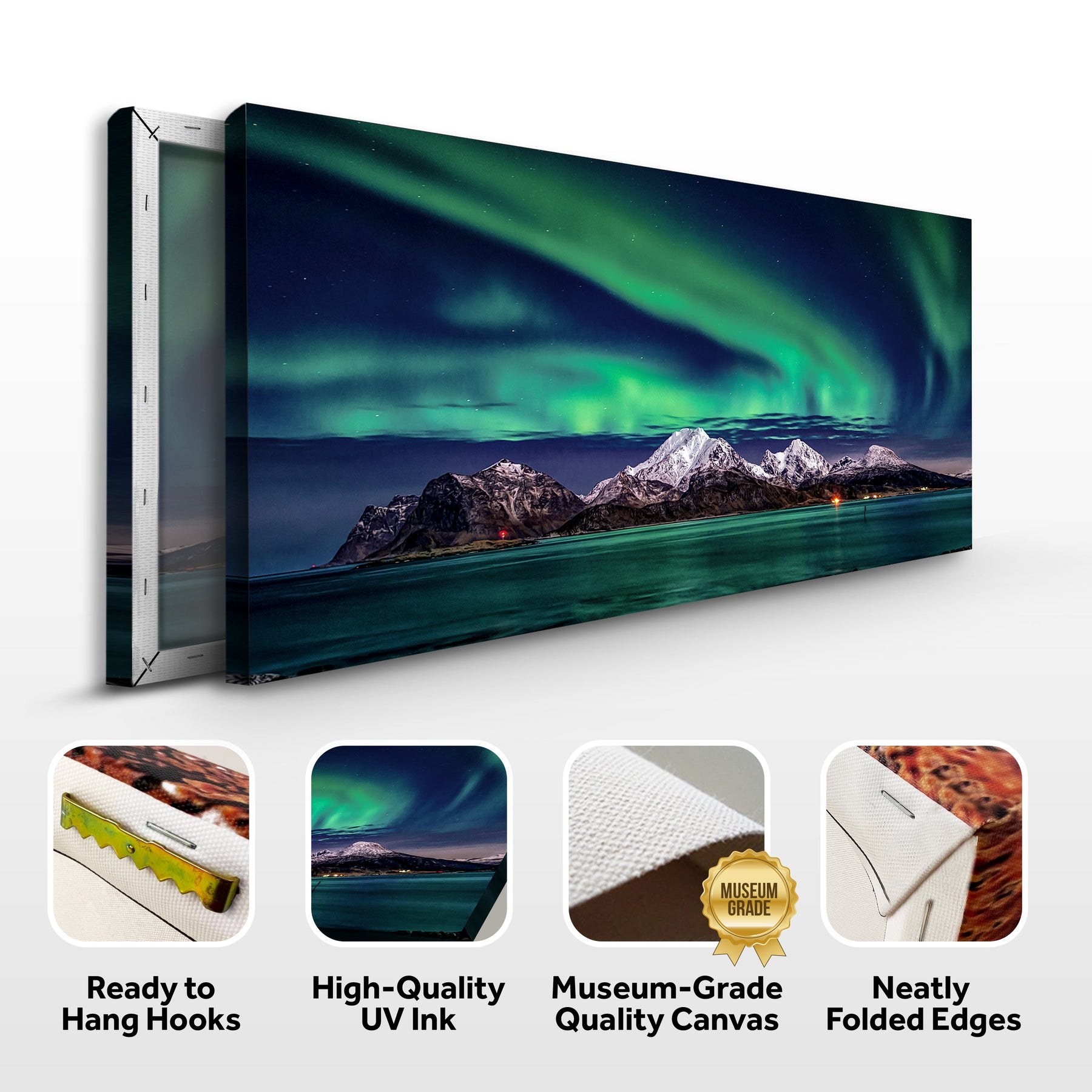 If you're a fan of the Northern Lights, then this Lake and Northern Lights Wall Art Canvas is the perfect piece to add to your collection. This canvas is made from high-quality material with a matte finish and will last for years. The canvas comes ready to hang with no framing required—just hang it up on the wall where you want it!