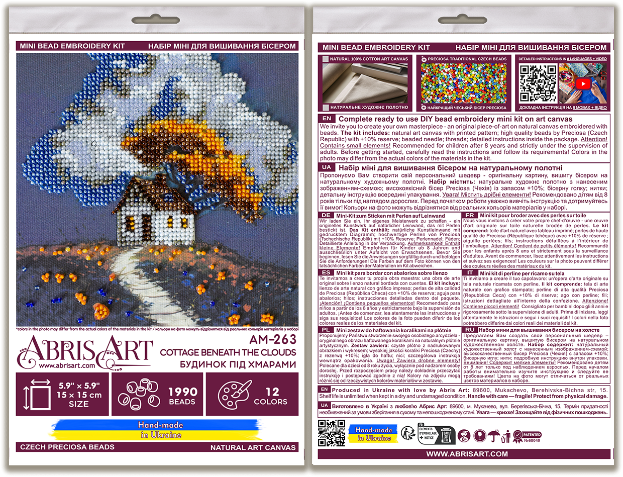 In each carefully assembled box Mini Bead embroidery kit Cottage Beneath the Clouds after purchase and delivery you will find: a large piece of natural art canvas with a printed image-scheme (fabric for embroidery) larger than the size of the picture - 150 x 150 mm. - with enough stock to make it convenient to embroider and design the finished picture! The world's best beads Preciosa Ornela (Czech Republic), with "stock" - more than 1990 beads, high-quality bead needles from Japan , and most importantly - detailed instructions, the scheme for beadwork with a key, specially developed by our designers for each plot separately and already applied to the canvas!