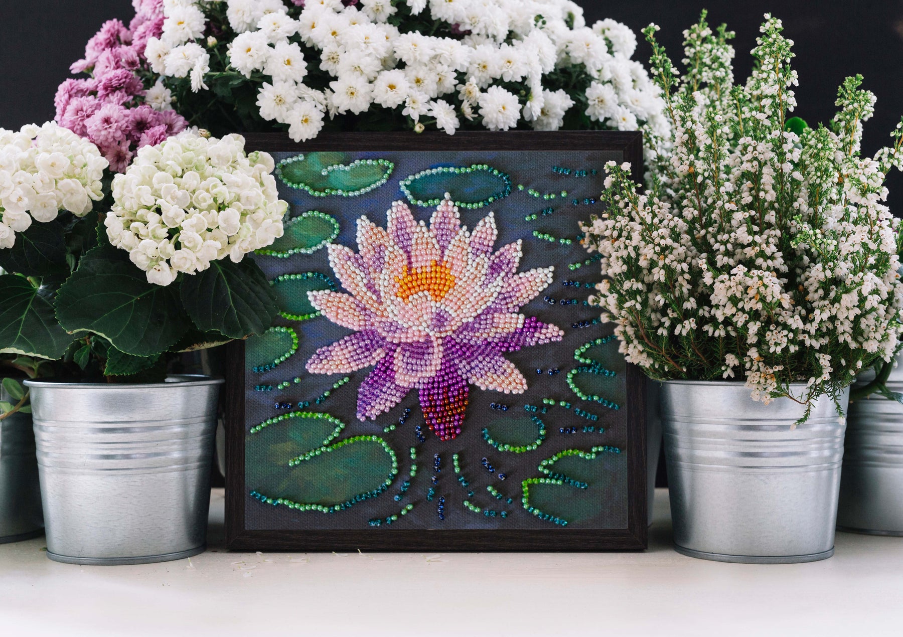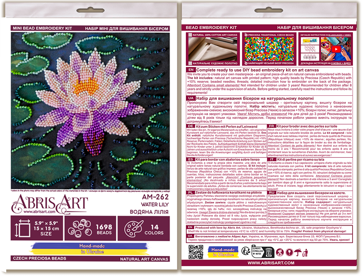 In each carefully assembled box Mini Bead embroidery kit Water lily after purchase and delivery you will find: a large piece of natural art canvas with a printed image-scheme (fabric for embroidery) larger than the size of the picture - 150 x 150 mm. - with enough stock to make it convenient to embroider and design the finished picture! The world's best beads Preciosa Ornela (Czech Republic), with "stock" - more than 1698 beads, high-quality bead needles from Japan , and most importantly - detailed instructions, the scheme for beadwork with a key, specially developed by our designers for each plot separately and already applied to the canvas!