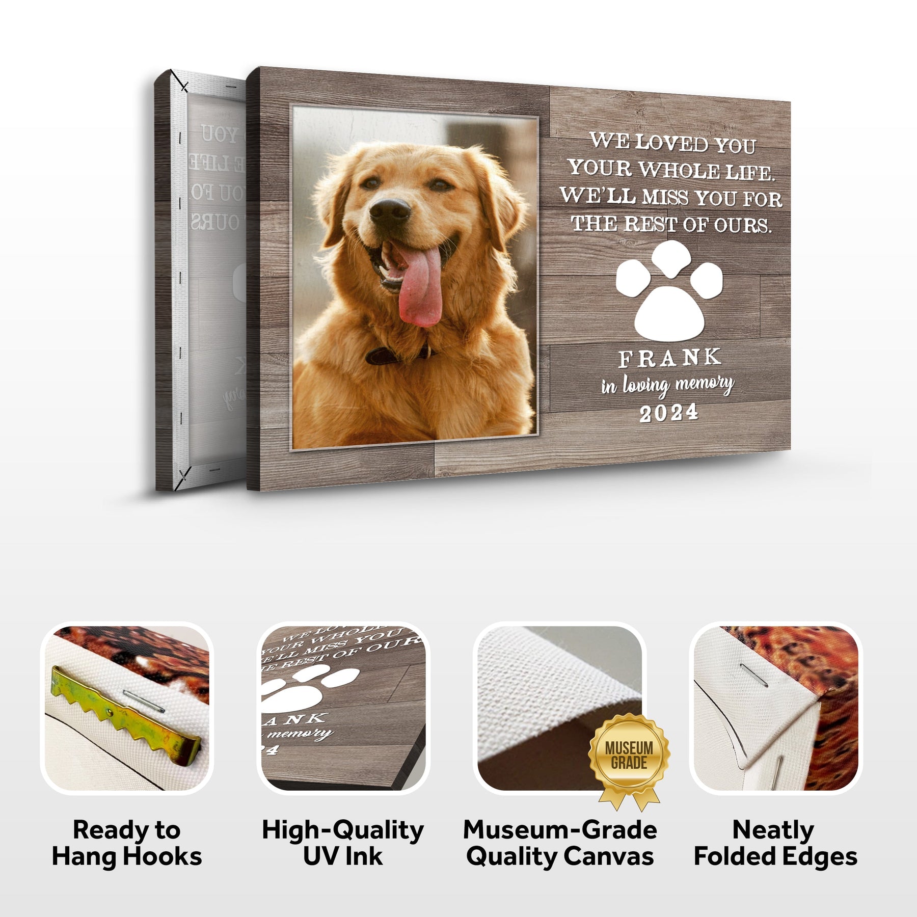 Let the memory of your beloved family member live on with this custom dog memorial pet loss frame portrait. Take comfort in the elegant wood patterns that will complement any photo canvas for any home décor style. Hang this passing gift in your pet's favorite room as a fitting tribute to the happy memories that you once shared.