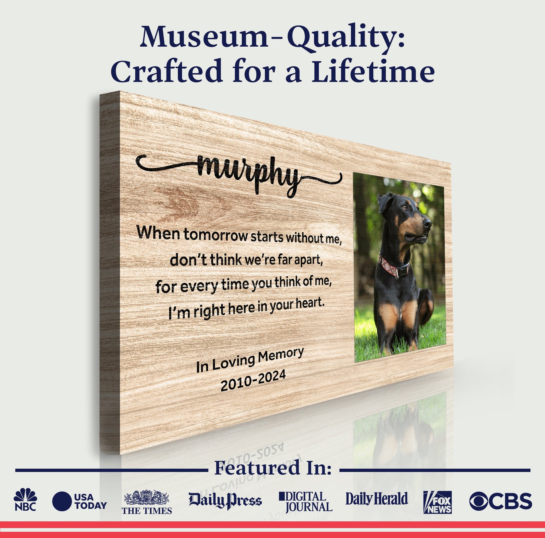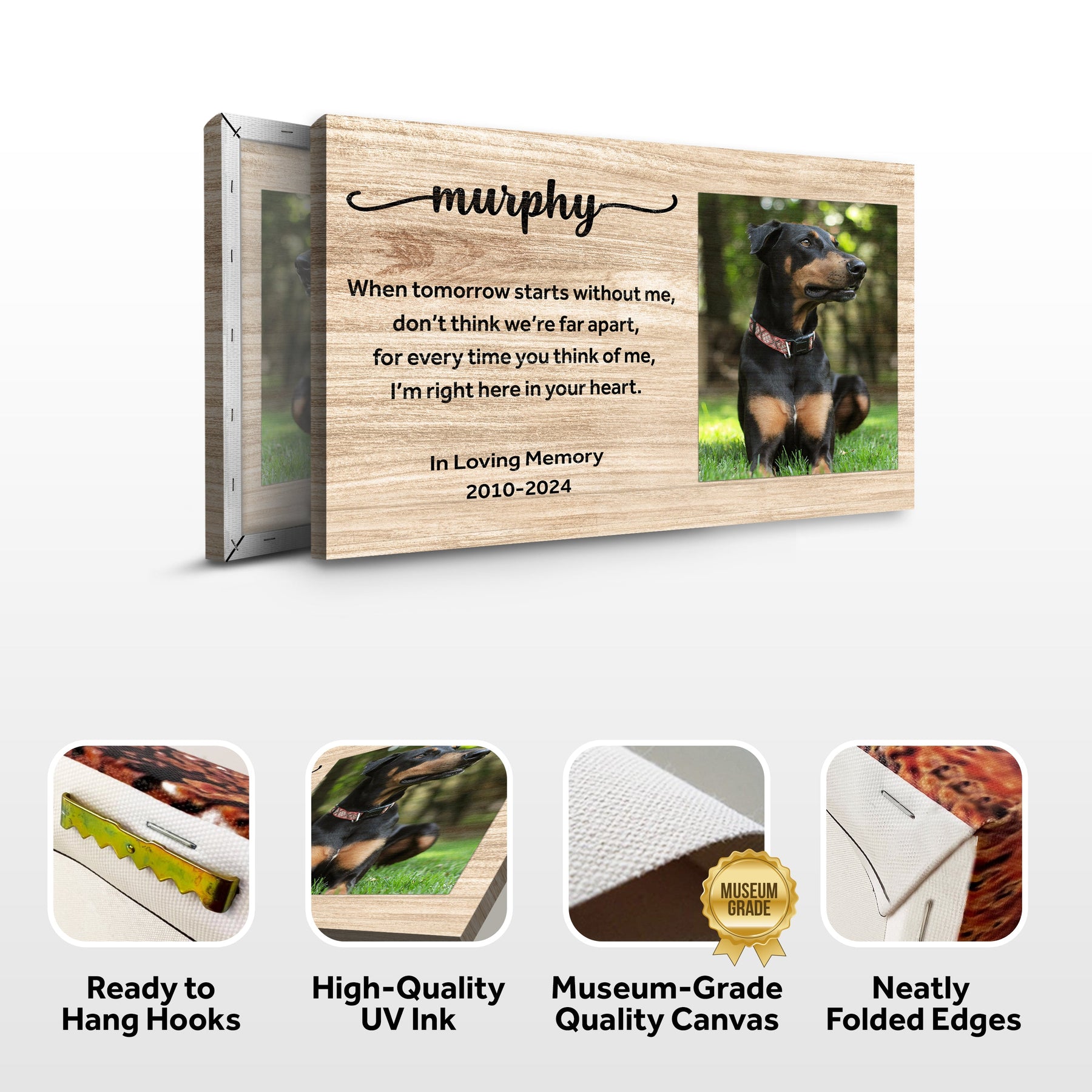 Let the memory of your beloved family member live on with this custom dog memorial pet loss frame portrait. Take comfort in the elegant wood patterns that will complement any photo canvas for any home décor style. Hang this passing gift in your pet's favorite room as a fitting tribute to the happy memories that you once shared.