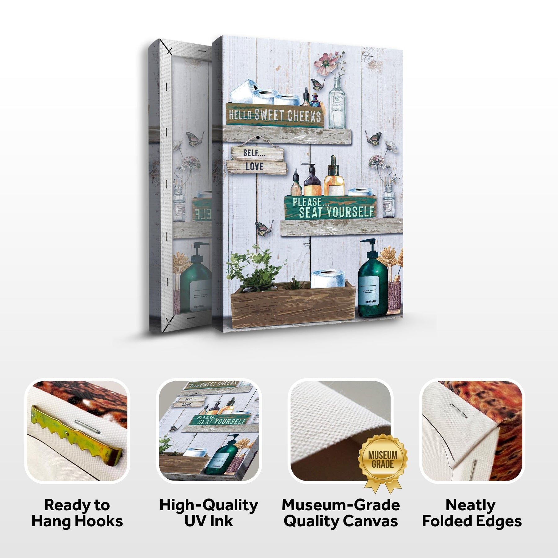 It's time to bring a bit more color and glamour to your bathroom wall with our Seat Yourself canvas wall art. This Seat Yourself wall art features cure typography with some bathroom essentials as its design. This Seat Yourself canvas print is one piece that will stand out in any room and add personality to your bathroom area.