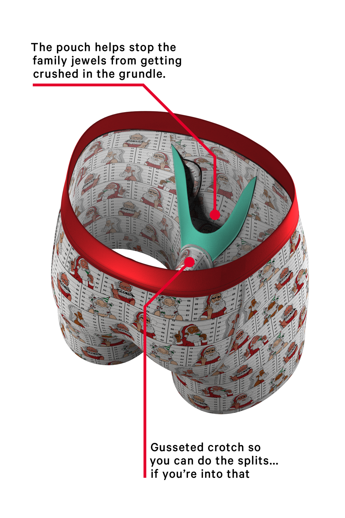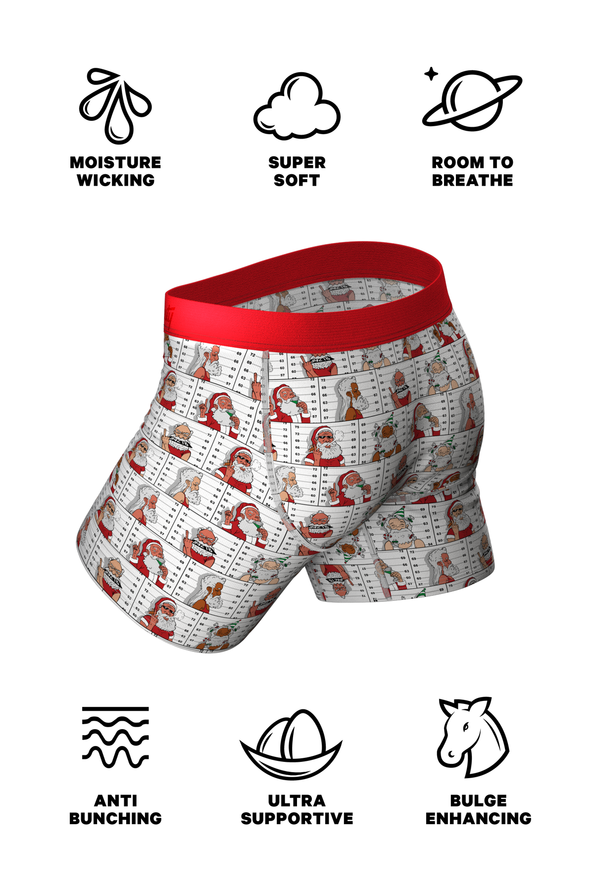 Wanted DEAD OR ALIVE for criminal sacketeering and crimes against elf-kind. Last spotted wearing nothing but this pair of Mugshot Santa Ball Hammock® Pouch Underwear.