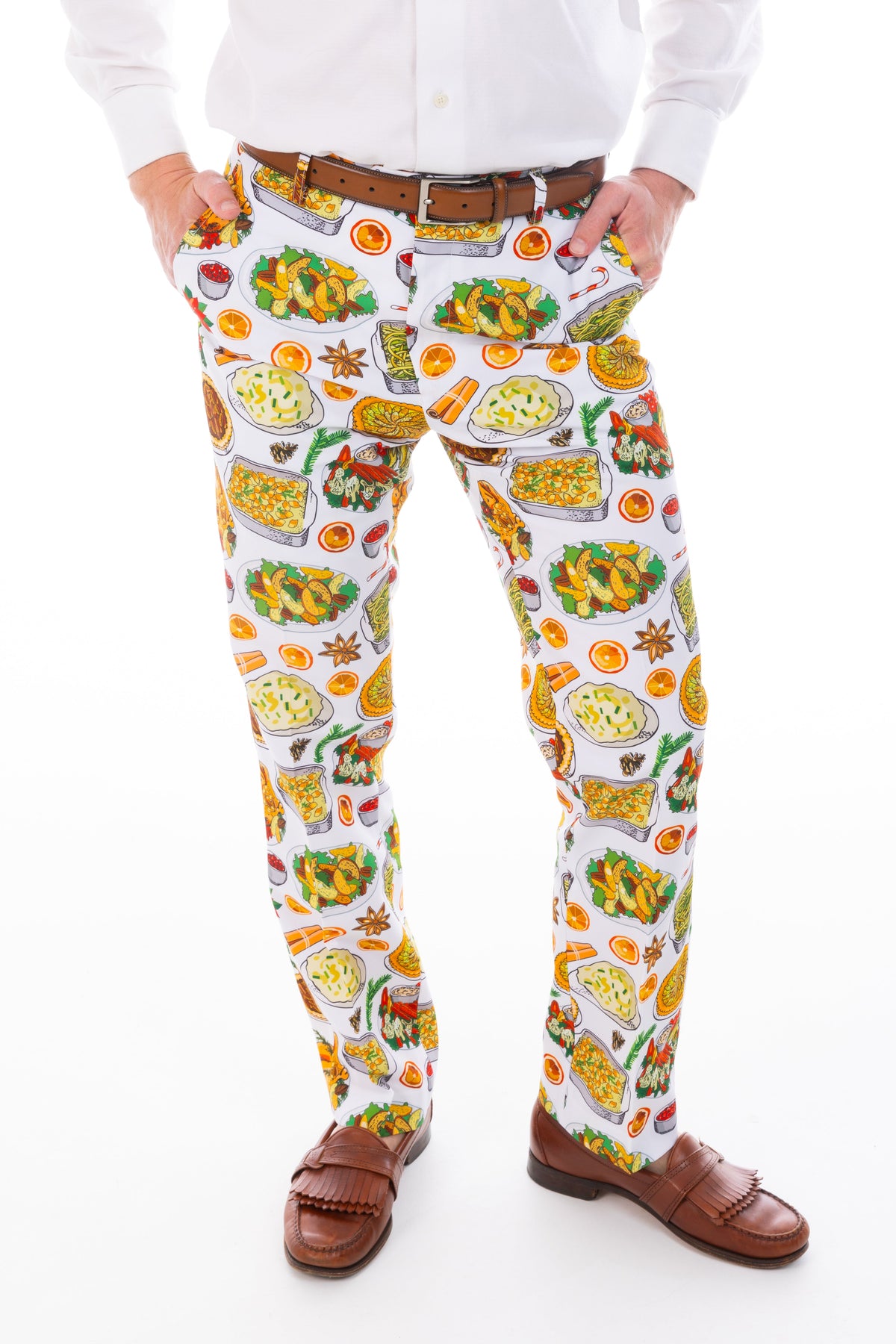 Show up to Thanksgiving this year wearing The Spread suit pants. You're the walking menu, an inspirational lil snack to everyone who looks your way. Carry a few hankies in your pocket to hand out to drooling family members.