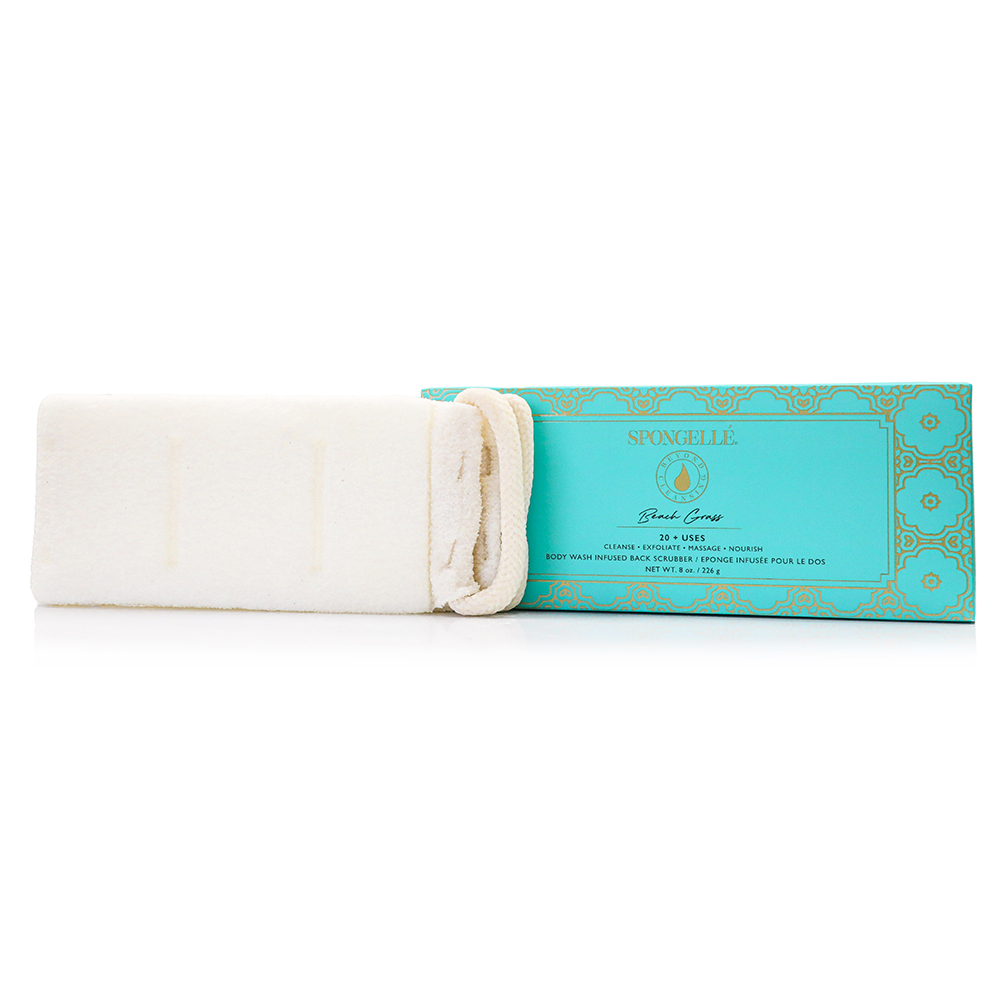 The Beach Grass Body Wash Infused Back Buffer is designed to tackle hard-to-reach areas. The extended length of this back scrubber cleanses and exfoliates with stretchable pull straps and a soft sponge design. Formulated with skin-softening natural ingredients and extracts of yuzu, edelweiss, and vetiver with aquatic, woody, and spicy notes to cleanse, exfoliate, massage and tone. Savor the relaxing scent of Beach Grass with every shower.