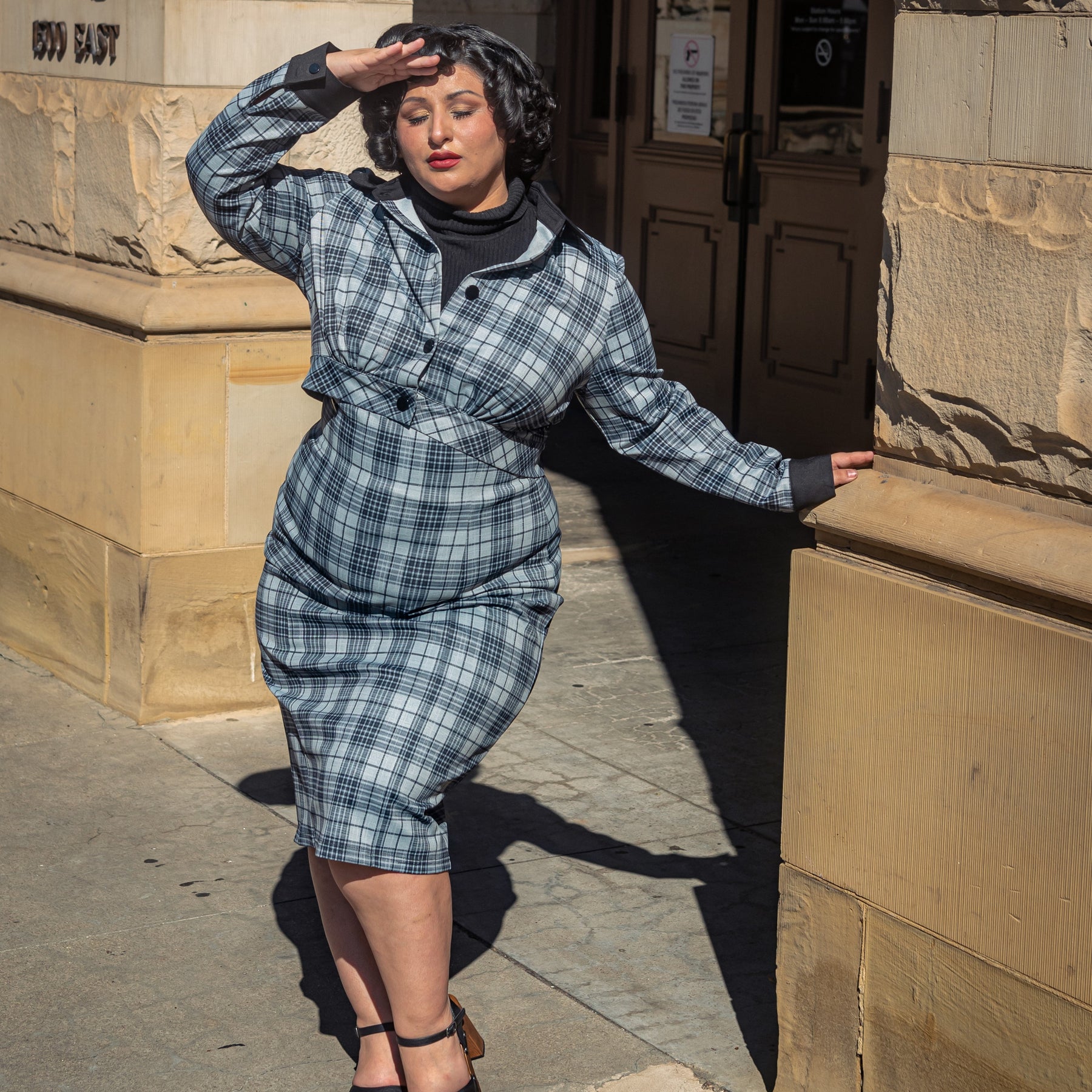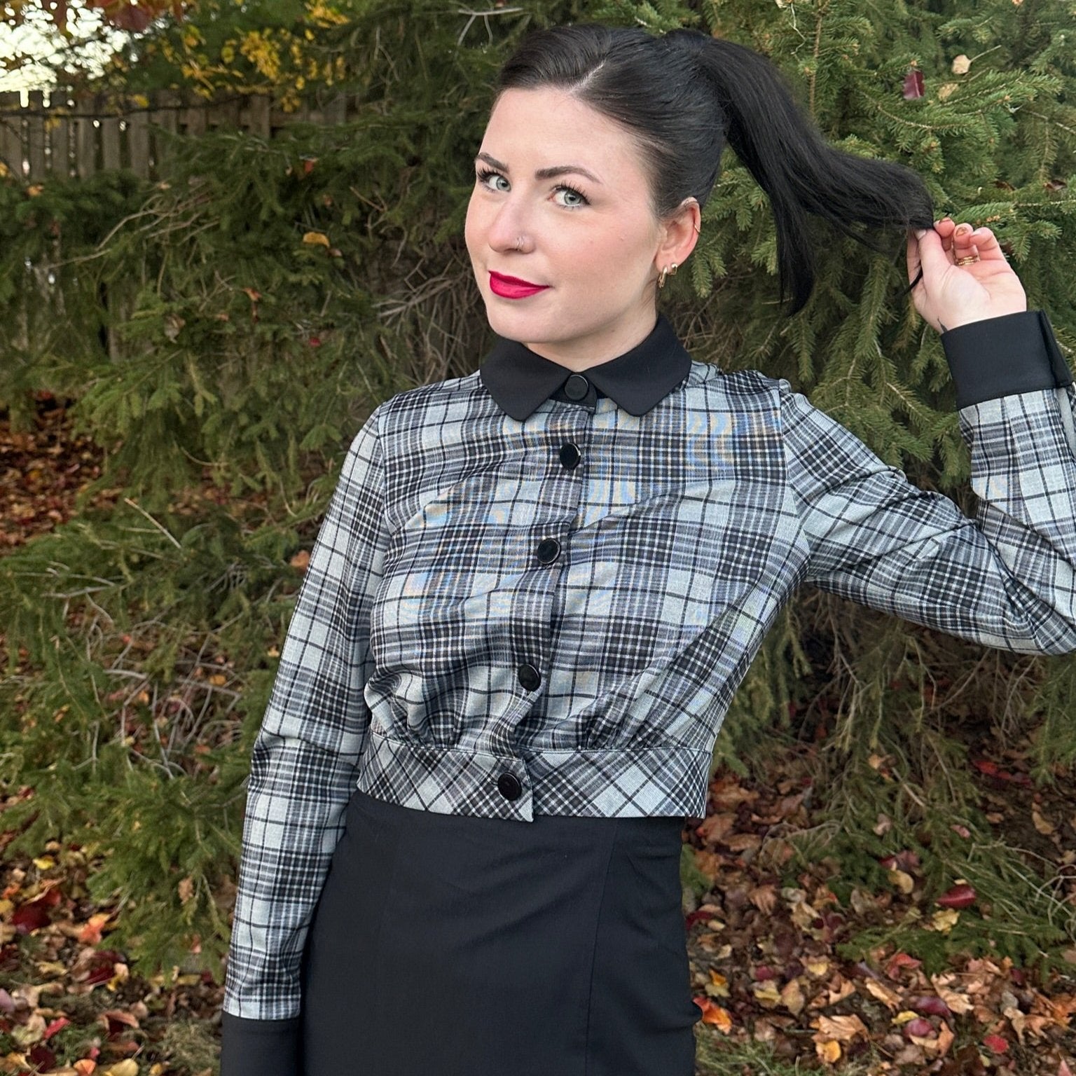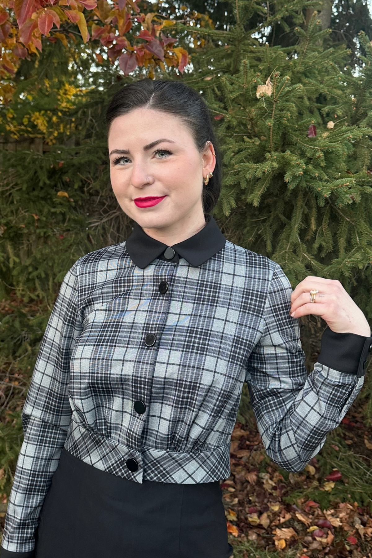 Introducing the Billie Jacket, the essential addition your wardrobe's been waiting for! As winter approaches, nothing exudes the cozy vibes of the season quite like a charming plaid pattern, and nothing says elegance quite like a finely tailored jacket. This cropped Charcoal Plaid jacket is the perfect match for our Charcoal Plaid Jumper Pencil, creating a polished suit-inspired ensemble. However, don't limit yourself – this 1950's-style jacket complements various pieces in your wardrobe, whether it's skirts, pants, or a classic pencil dress. Its standout features include bold black buttons and eye-catching contrasting collar and cuffs.