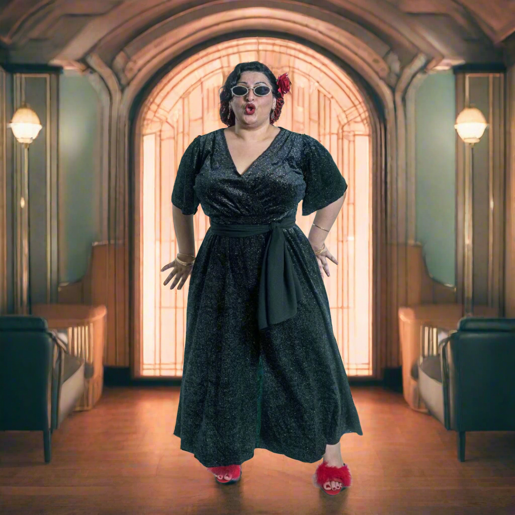Turn heads and steal the spotlight in the Charlie Jumpsuit—a dazzling blend of old Hollywood glam and modern sophistication. Crafted from sleek black dazzle fabric that catches the light just right, this jumpsuit features a sultry V-neckline, graceful short sleeves, and midi-length wide legs that flow with every step. The elasticized waist cinches you in just enough to flatter your silhouette while keeping you comfortable all night long.