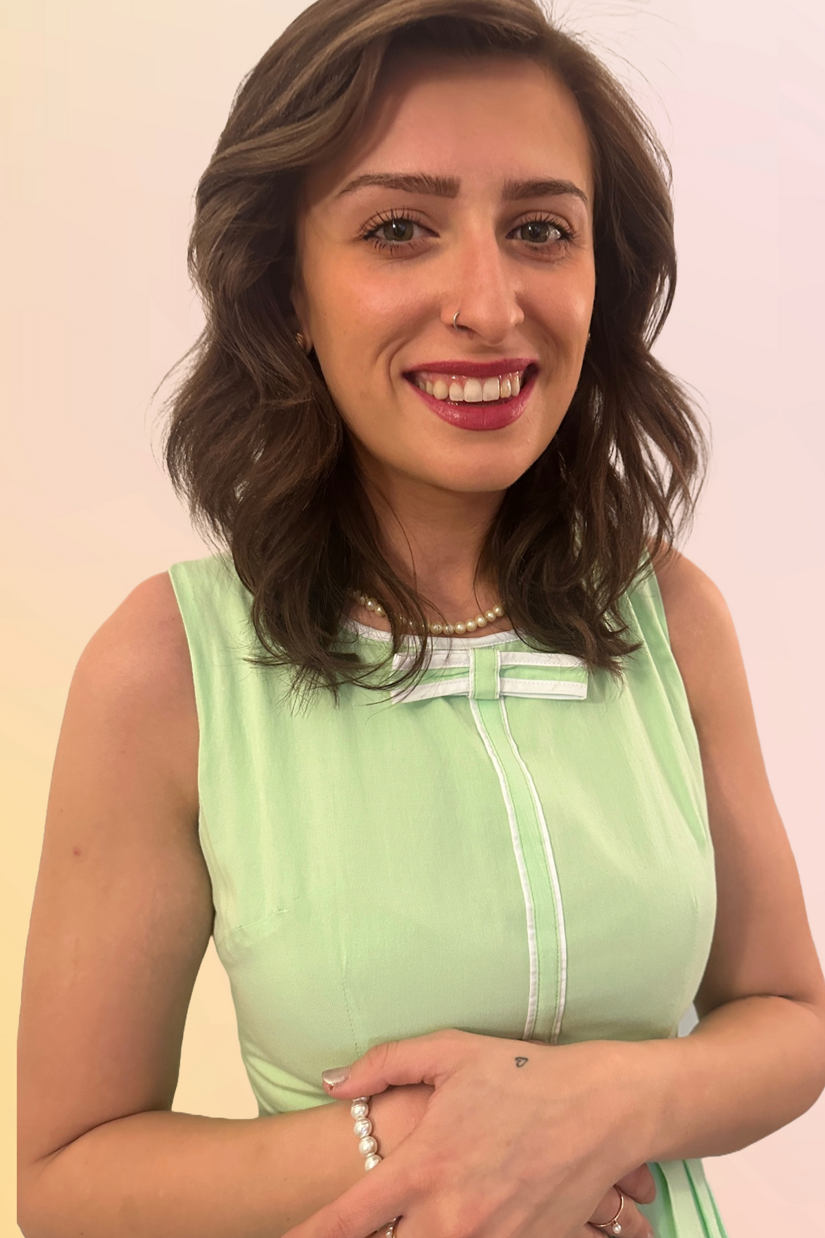 Samantha will add some cheer and positive energy to your wardrobe. Reminiscent of the 1960's color palettes of soft light green with white trim detail on the bow and center front makes this darling dress perfect for casual everyday wear. Features pleated circle skirt with hidden side seam pockets.