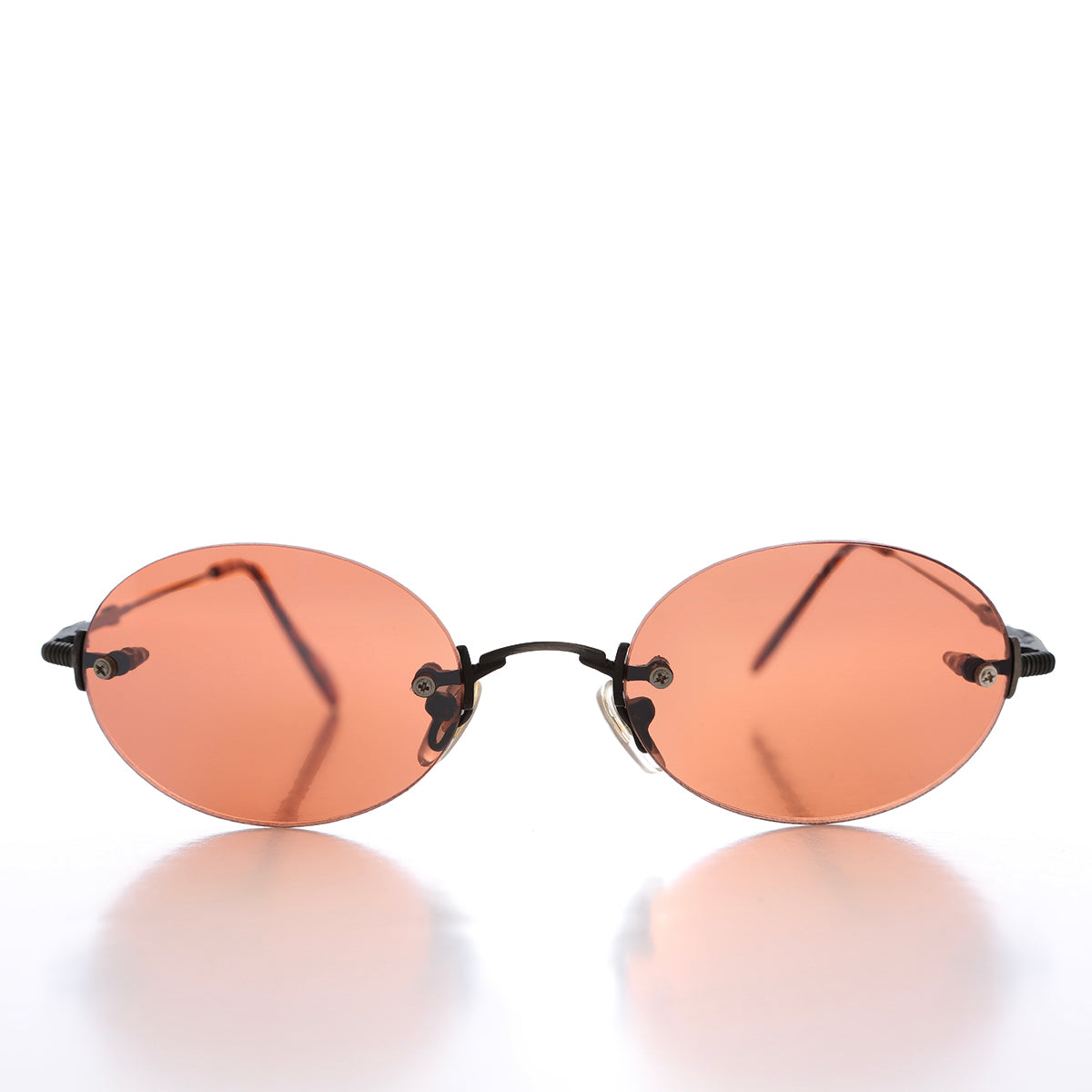 This classic stylish sunglass features a rimless oval enhancing natural colors copper lens and lightweight metal frame. New old stock. Never worn. Great condition. UV protection.