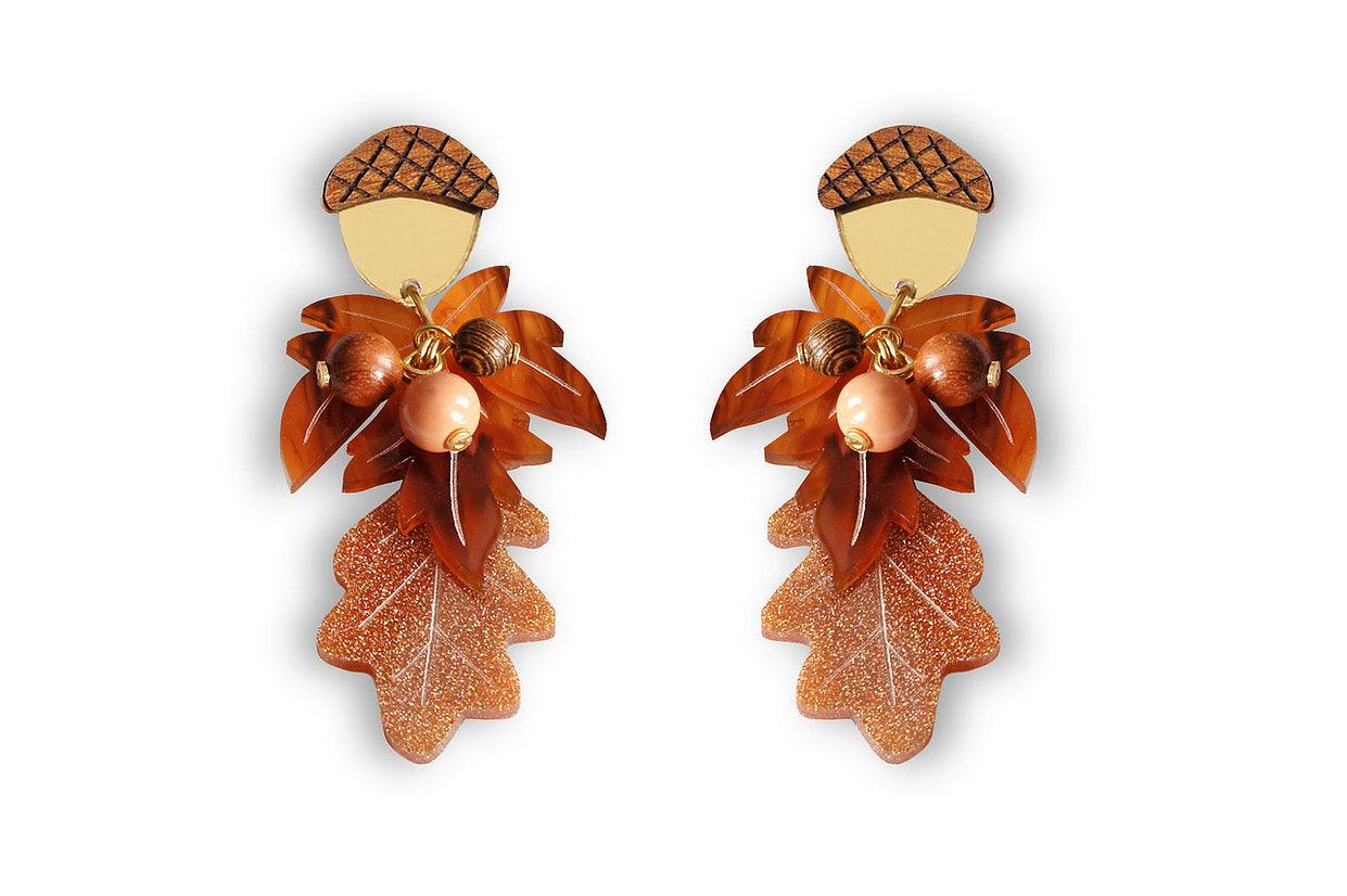 Earrings made with wood, tortoiseshell methacrylate, glitter effect methacrylate and gold mirror. It also has three ball-shaped beads in the center of the leaves.