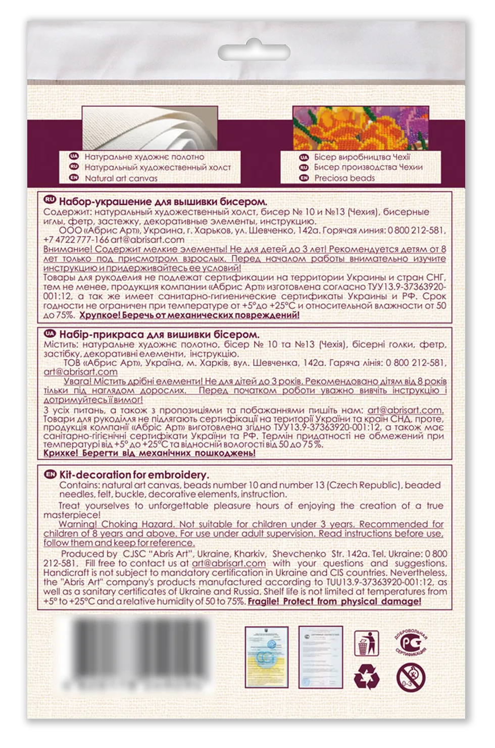 Kit contains: Beads, needles, felt, decorative elements, instructions. In each carefully assembled box you will find: a large piece of natural art canvas with a printed image-scheme (fabric for embroidery) larger than the size of the picture - with enough stock to make it convenient to embroider . The world's best beads Preciosa Ornela (Czech Republic), with "stock" , high-quality bead needles from Japan , and most importantly - detailed instructions, the scheme for beadwork with a key, specially developed by our designers for each plot separately and already applied to the canvas. Beads (14 colours). Dimensions 5,1*6,6cm / 2,01*2,6in. Made in Ukraine.