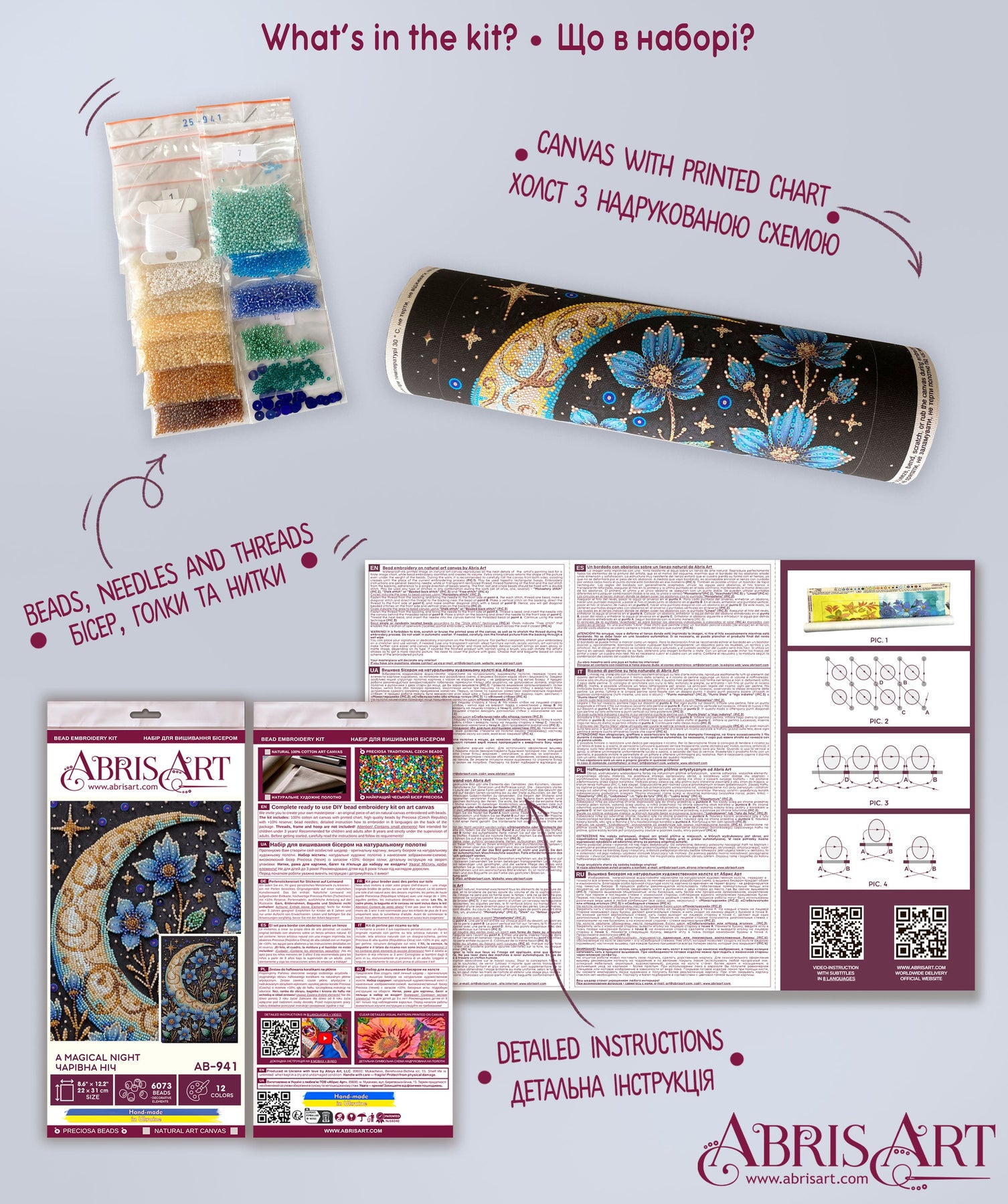 In each carefully assembled box Main Bead Embroidery Kit A magical night (Deco Scenes) after purchase and delivery you will find: a large piece of natural art canvas with a printed image-scheme (fabric for embroidery) larger than the size of the picture - 310 x 220 mm. - with enough stock to make it convenient to embroider and design the finished picture! The world's best beads Preciosa Ornela (Czech Republic), with "stock" - more than 6073 beads, high-quality bead needles from Japan , and most importantly - detailed instructions, the scheme for beadwork with a key, specially developed by our designers for each plot separately and already applied to the canvas!