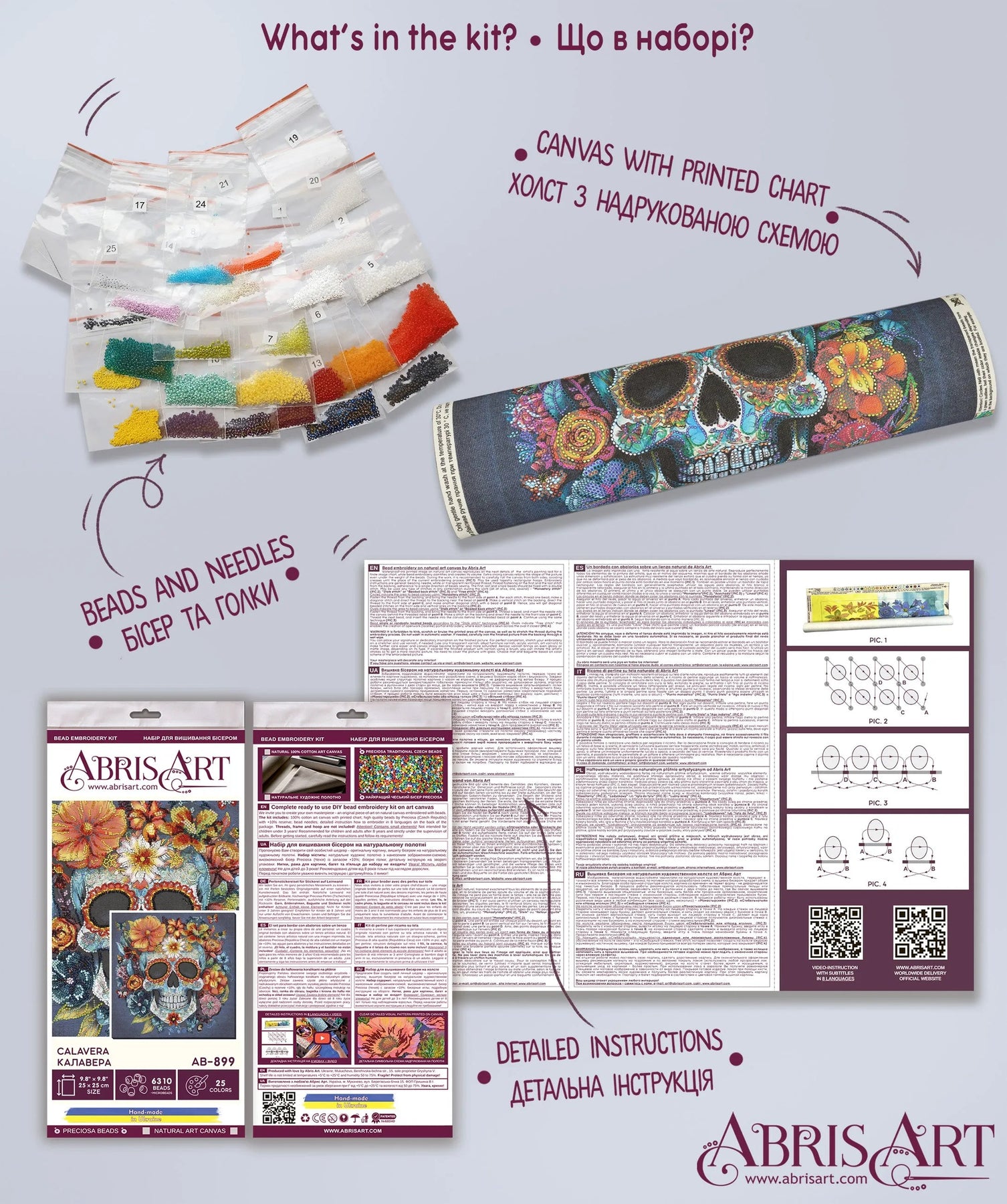In each carefully assembled box Main Bead Embroidery Kit Calavera (Deco Scenes) after purchase and delivery you will find: a large piece of natural art canvas with a printed image-scheme (fabric for embroidery) larger than the size of the picture - 250 x 250 mm. - with enough stock to make it convenient to embroider and design the finished picture! The world's best beads Preciosa Ornela (Czech Republic), with "stock" - more than 6310 beads, high-quality bead needles from Japan , and most importantly - detailed instructions, the scheme for beadwork with a key, specially developed by our designers for each plot separately and already applied to the canvas!