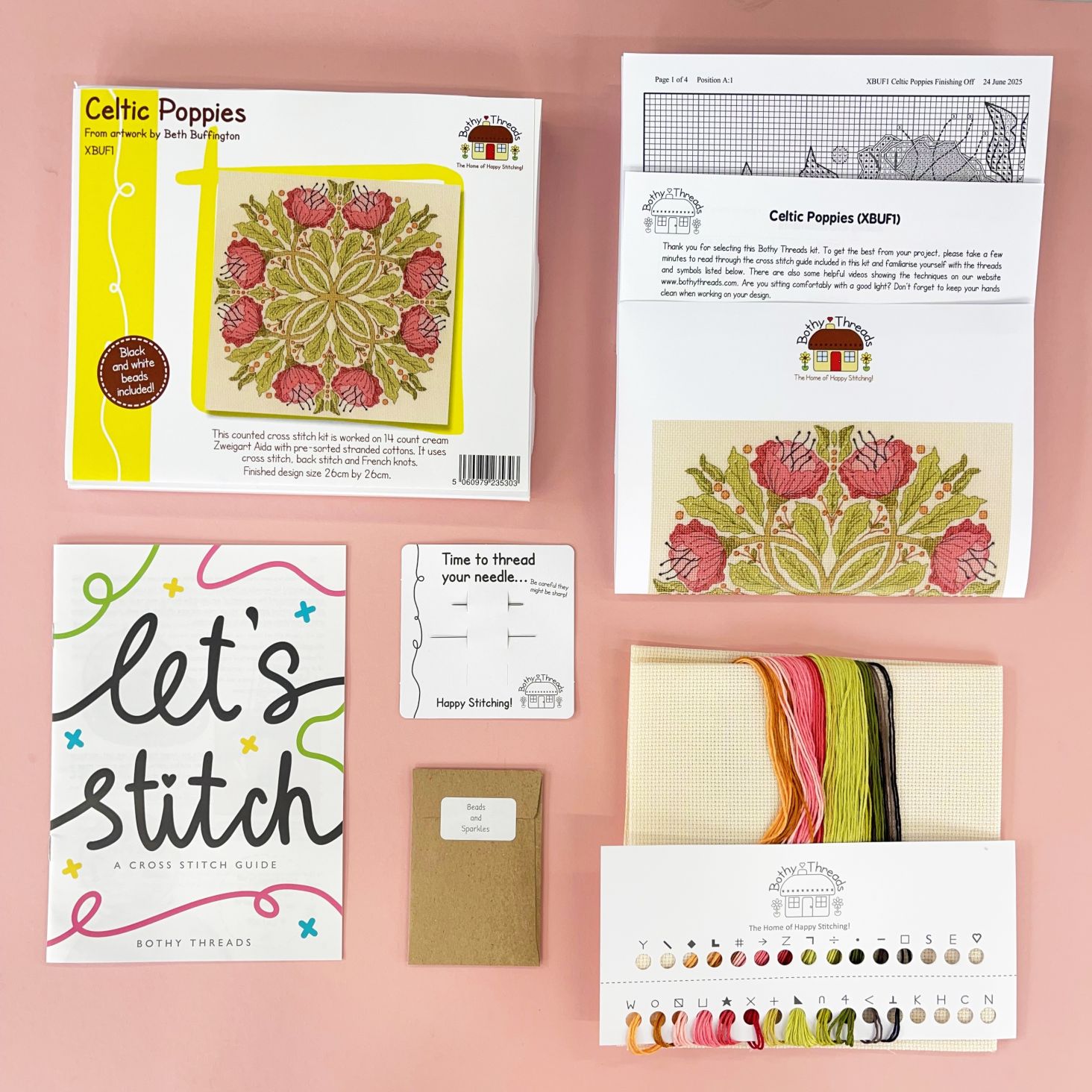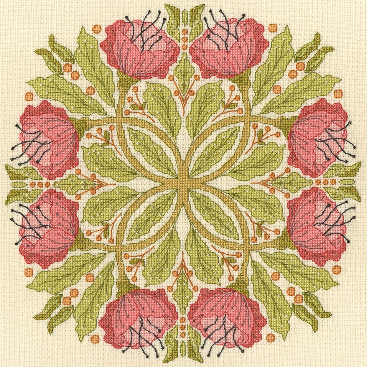 This counted cross stitch kit is worked on 14 count cream Zweigart Aida with pre-sorted stranded cottons. It uses cross stitch, back stitch and French knots.