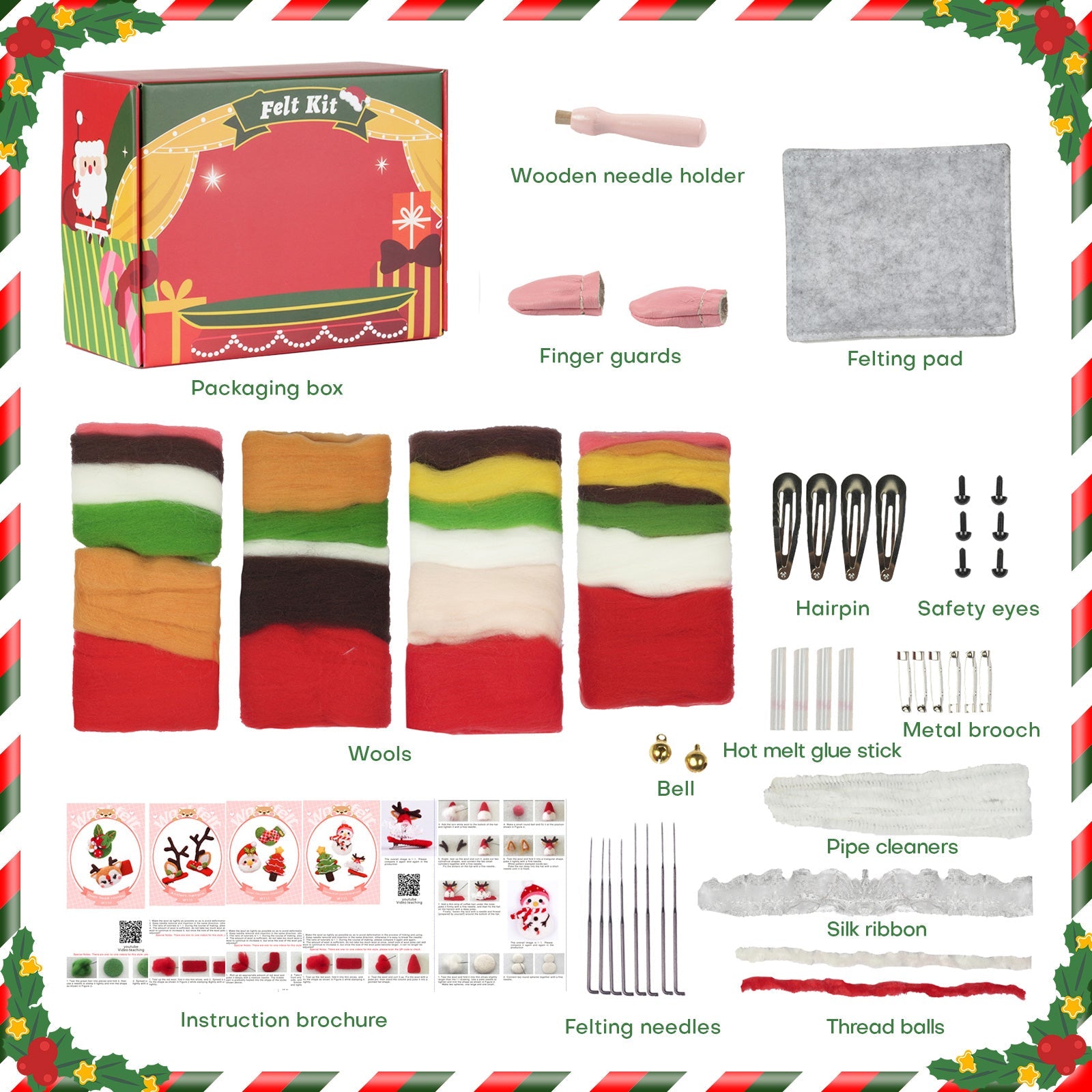 Kit Contains: basic brochure, crocheting instruction, crochet hook, marker, fiberfill, eyes, threads, needle, fingercot, wooden handles, keychains, needle felt pod.