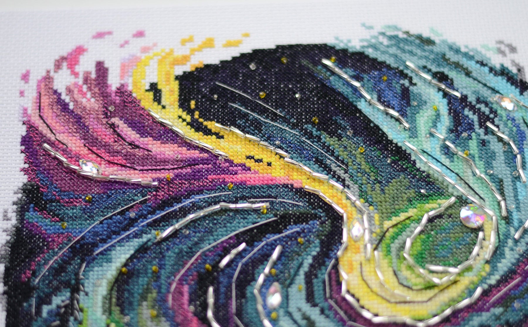 The set is completed with canvas 370*370 mm white color count 14, threads 96 m and additionally PRECIOSA beads No. 10 (2 colors) and a needle for embroidery with beads, glass beads - 160 pcs., decorative glass stones - 5 pcs.