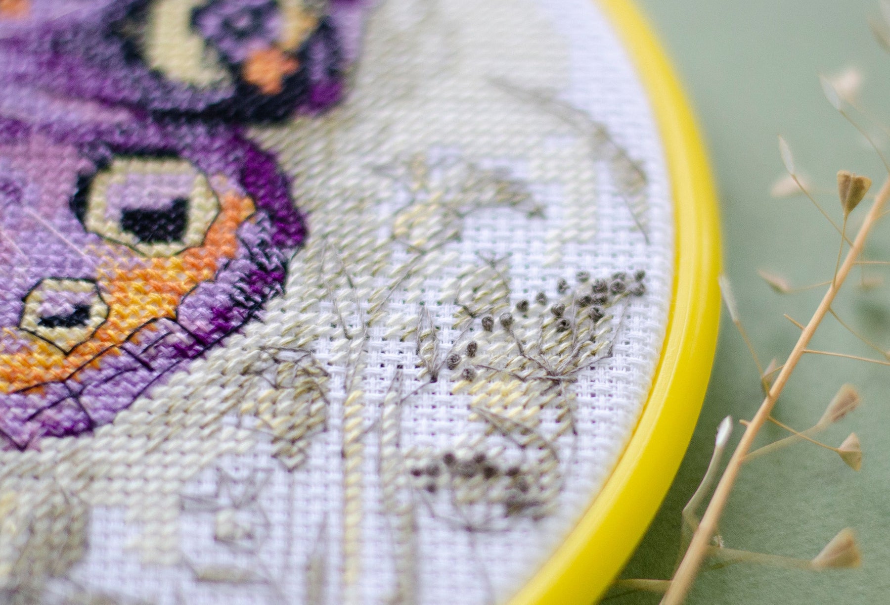 The set is completed with canvas 220*220 mm white color count 14, decorative hoops.