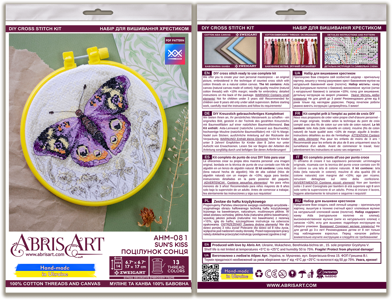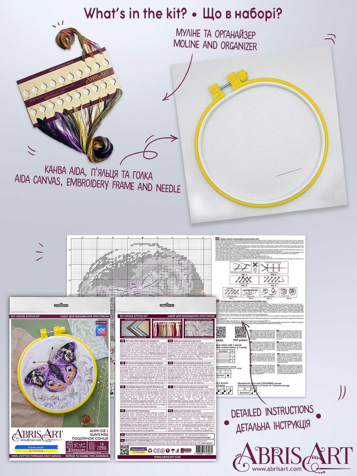 In each carefully assembled box Cross-stitch kits Sun's Kiss after purchase and delivery you will find: a large piece of canvas (embroidery fabric) larger than the size of the picture - 170 x 170 mm. - with enough margin to comfortably embroider and decorate the finished picture! As well as a special needle for cross-stitching and all the necessary threads (floss) - 13 colors on a convenient organizer, of course - with a margin, because you can embroider with a cross in different ways. And most importantly - detailed instructions, a cross-stitch pattern, specially designed by our designers for each set separately!