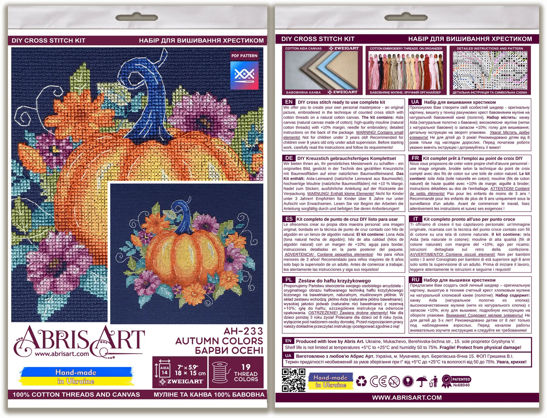 In each carefully assembled box Cross-stitch kits Autumn colors (Deco Scenes) after purchase and delivery you will find: a large piece of canvas (embroidery fabric) larger than the size of the picture - 150 x 180 mm. - with enough margin to comfortably embroider and decorate the finished picture! As well as a special needle for cross-stitching and all the necessary threads (floss) - 19 colors on a convenient organizer. And most importantly - detailed instructions, a cross-stitch pattern, specially designed by our designers for each set separately!