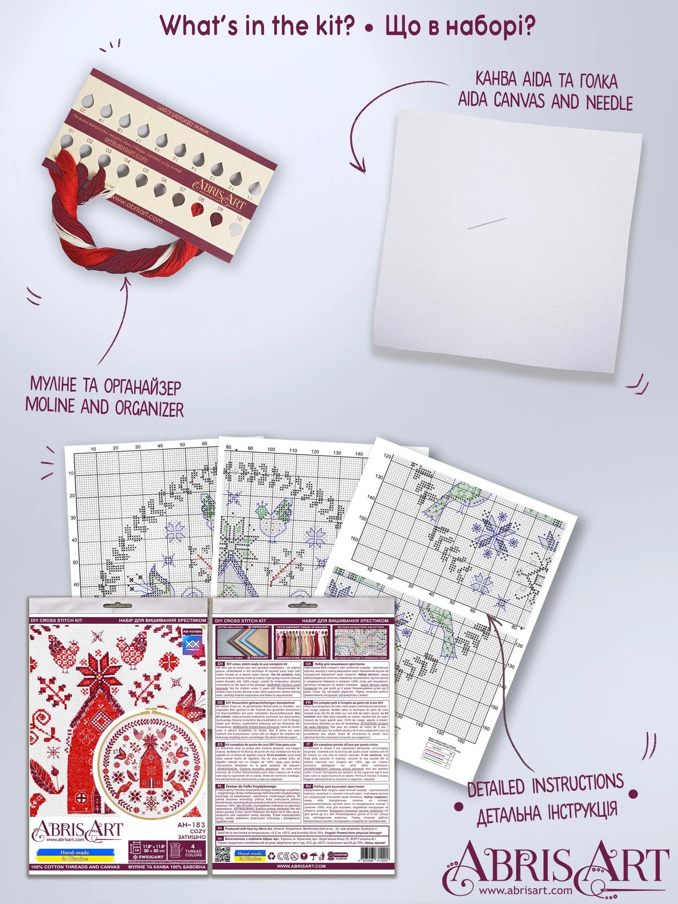 Kit contains: Canvas Zweigart 100% cotton (14 count), convenient symbol scheme + instruction in 8 languages, needles. The set is completed with canvas 400*400 mm white, count 14. The set is not complete with hoops. The set is complete with additionally PRECIOSA #10 beads and needle for embroidery with beads. Floss on a convenient organizer - 100% cotton (4 colours). Dimensions 30*30cm / 11,81*11,81in. Made in Ukraine.