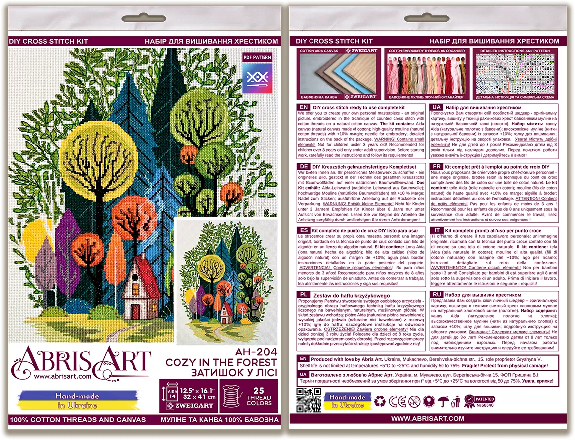 Kit contains: Canvas Zweigart 410*320 mm ecru color count 14, threads 156 m, convenient symbol scheme + instruction in 8 languages, needles, floss on a convenient organizer - 100% cotton (25 colours), Dimensions 32*41cm / 12,6*16,14in. Made in Ukraine.
