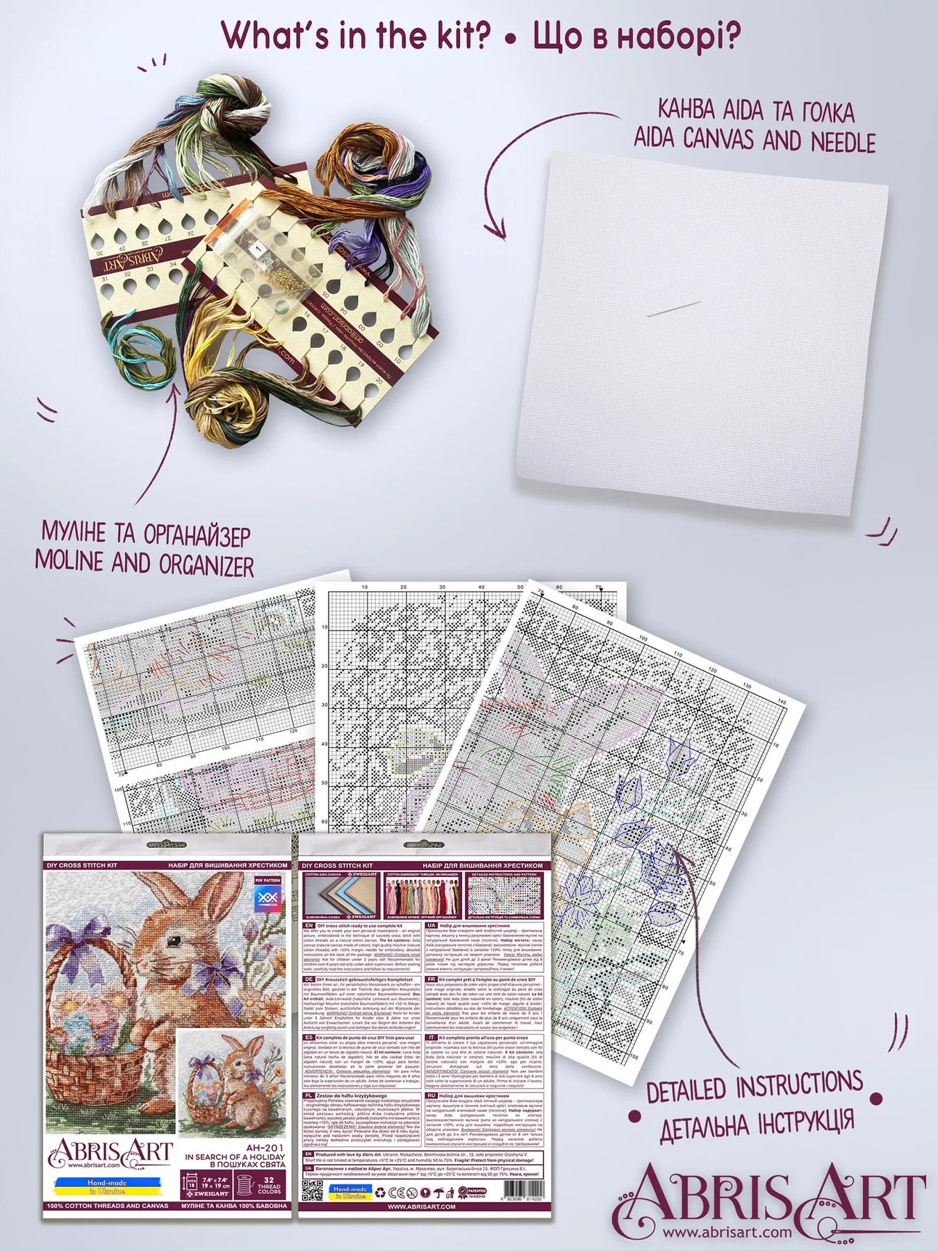 Kit contains: Canvas Zweigart 100% cotton (18 count), convenient symbol scheme + instruction in 8 languages, needles. The set is complete with additionally PRECIOSA #10 beads and needle for embroidery with beads. Floss on a convenient organizer - 100% cotton (32 colours). Dimensions 19*19cm / 7,48*7,48in. Made in Ukraine.