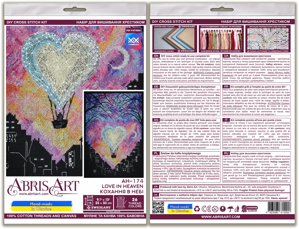 Kit contains: Canvas Zweigart 100% cotton (14 count), convenient symbol scheme + instruction in 8 languages, needles. The set is complete with canvas 330*430mm black color count 14, threads 97m and additionally PRECIOSA #10 beads and needle for embroidery with beads. Floss on a convenient organizer - 100% cotton (26 colours). Dimensions 23*33cm / 9,06*12,99in. Made in Ukraine.