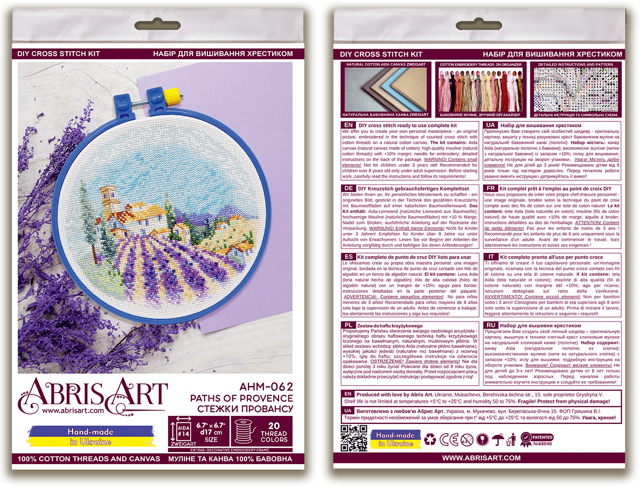 Kit contains: Canvas 100% cotton (14 count), convenient symbol scheme + instruction in 8 languages, needles, floss on a convenient organizer - 100% cotton (5 colours), Dimensions 17*17cm / 6,69*6,69in. Made in Ukraine. Embroidery hoop is included.