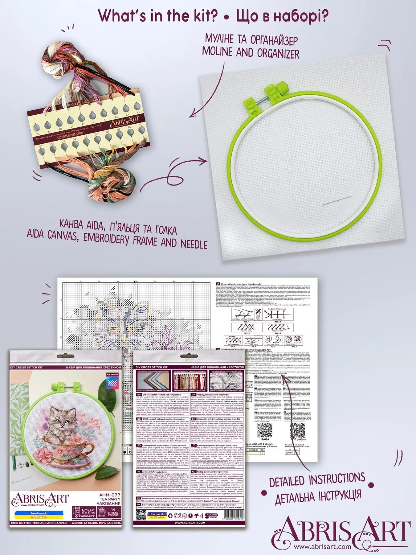 Kit contains: Canvas Zweigart 100% cotton (14 count), convenient symbol scheme + instruction in 8 languages, needles. The set is complete with additionally PRECIOSA #10 beads and needle for embroidery with beads. Floss on a convenient organizer - 100% cotton (19 colours), Dimensions 17*17cm / 6,69*6,69in. Made in Ukraine. Embroidery hoop is included.