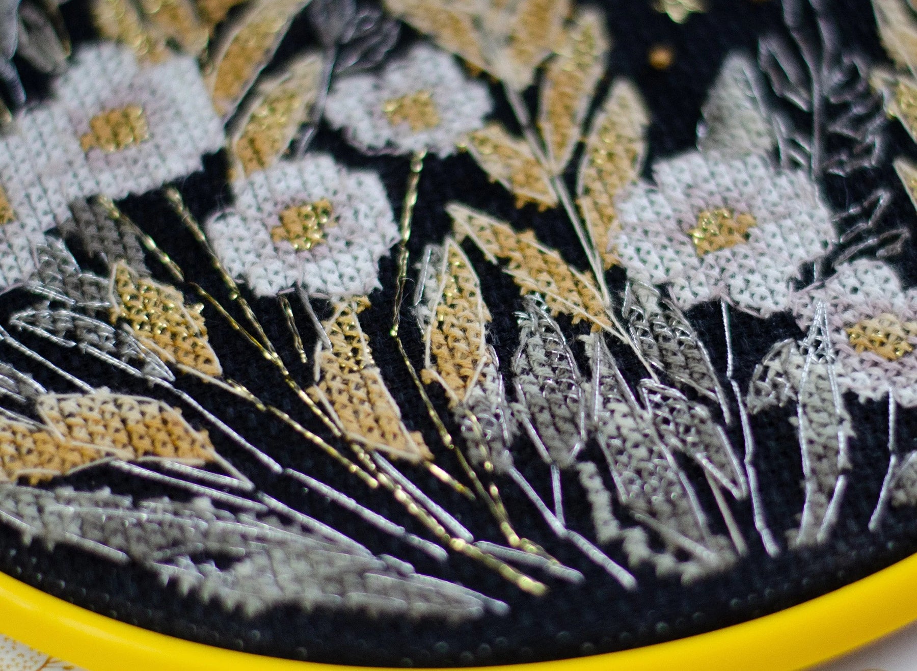 The set is completed with canvas 220*220mm black, count 14, threads 54m, of which decorative metallized thread of silver color - 16m and golden color - 16m. (11 colours), Dimensions 17*17cm / 6,69*6,69in. Made in Ukraine.