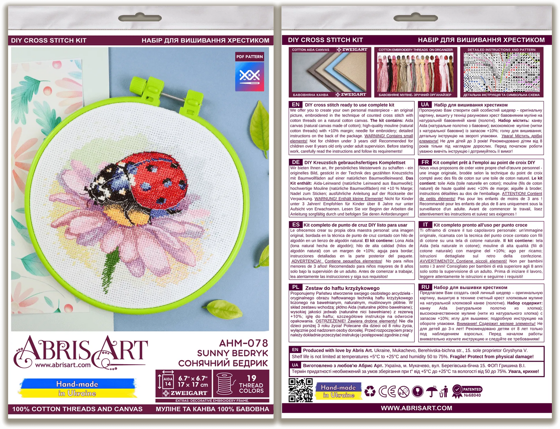In each carefully assembled box Cross-stitch kits Sunny Bedryk after purchase and delivery you will find: a large piece of canvas (embroidery fabric) larger than the size of the picture - 170 x 170 mm. - with enough margin to comfortably embroider and decorate the finished picture! As well as a special needle for cross-stitching and all the necessary threads (floss) - 19 colors on a convenient organizer, of course - with a margin, because you can embroider with a cross in different ways. And most importantly - detailed instructions, a cross-stitch pattern, specially designed by our designers for each set separately!