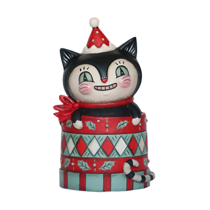 Introducing the Dezzy Merry Boo Gift Box by Johanna Parker, a whimsical holiday treasure that adds playful charm to your Christmas decor! This festive black-and-white cat peeks out of a round holiday package, bringing a touch of mischief and cheer to your celebrations. The top of the box lifts off to reveal a hidden container, perfect for holding small gifts, sweet treats, or seasonal treasures. With Johanna Parker's signature vintage-inspired style, this delightful piece combines both functionality and festive flair. Hand-painted with intricate details, the 6-inch Dezzy Merry Boo is a perfect addition to your holiday collection, spreading joy with every little surprise inside!