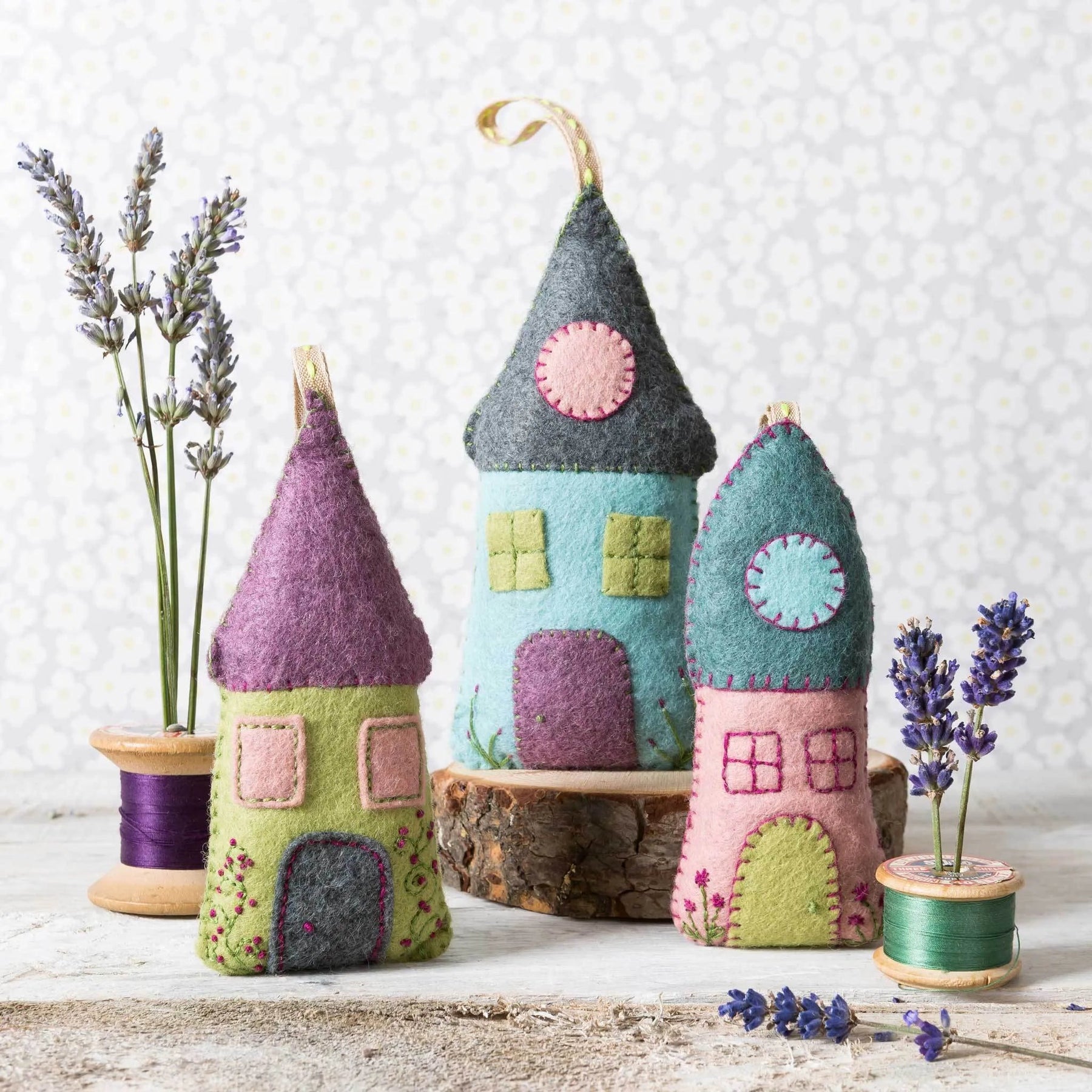 A gorgeous craft kit containing everything you need to make 3 wonderfully fragrant lavender-filled houses in soft vintage shades of felt.