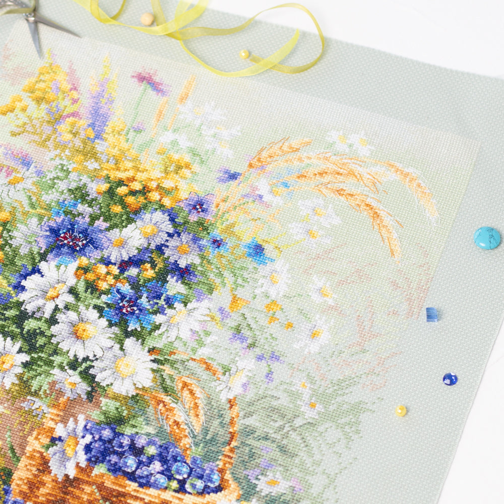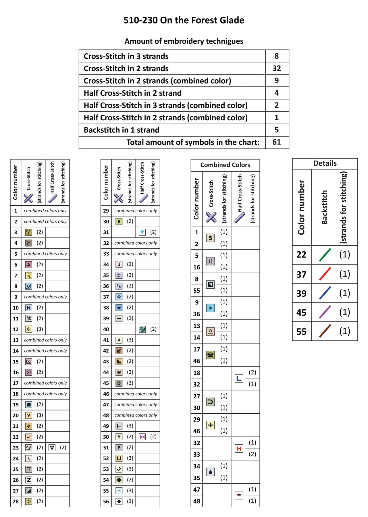 Kit contains: Fabric Zweigart Aida 14 (col.611, light green), Threads: mouline DMC, Number of Colors:56. Embroidery instructions in English, German, French and Spanish; color symbol scheme. Dimensions: 32*40cm / 12,6*15,75inches