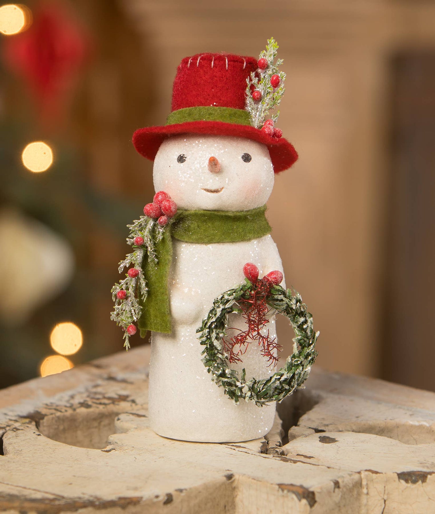 Get in the holiday spirit with this adorable traditional snowman by Michelle Allen of Raggedy Pants Designs. He is wearing a felt hat, a scarf with some glittered greenery accents, and he is holding a faux greenery wreath with lacquer berries and tinsel.