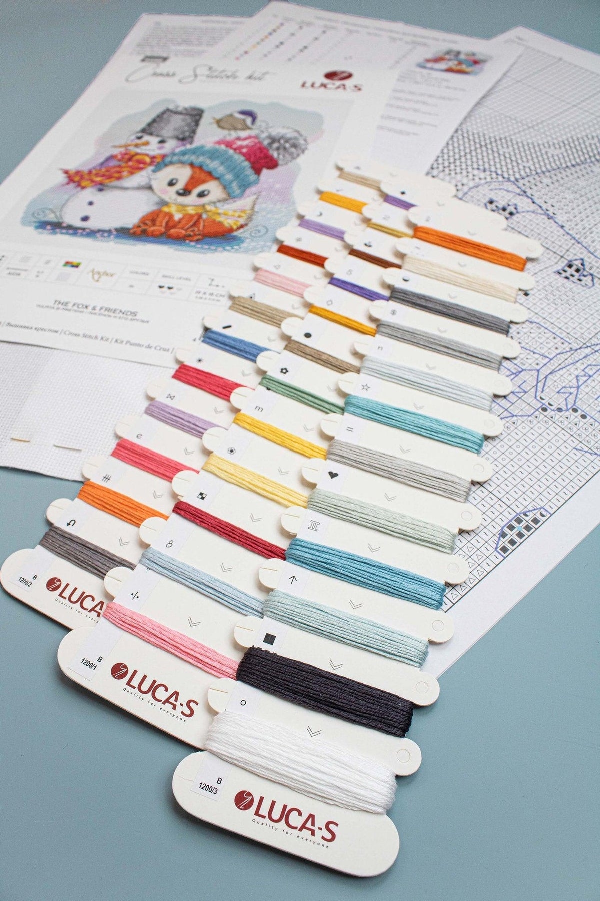 Kit contains: Fabric Zweigart Aida 16, Threads: Anchor Number of Colors: 36. Embroidery instructions with black-and-white symbols and colored backstitch (4 sheets, A3 format). Includes 2 embroidery needles №26. Stitch count: 118 x 114. Fabric size: 33 x 32 cm. Dimensions: 19 x 18 cm / 7.38 x 7.13 inches.