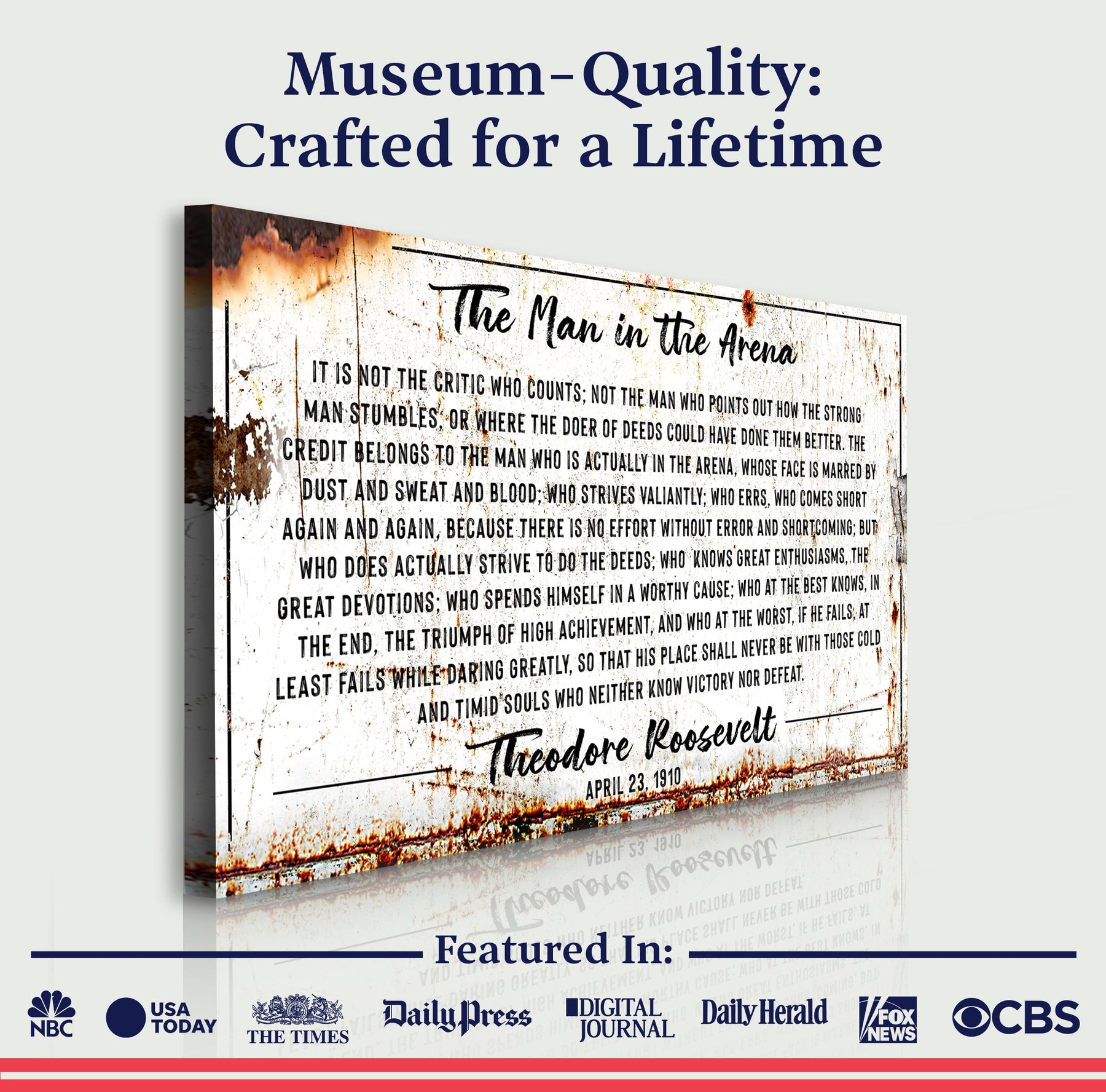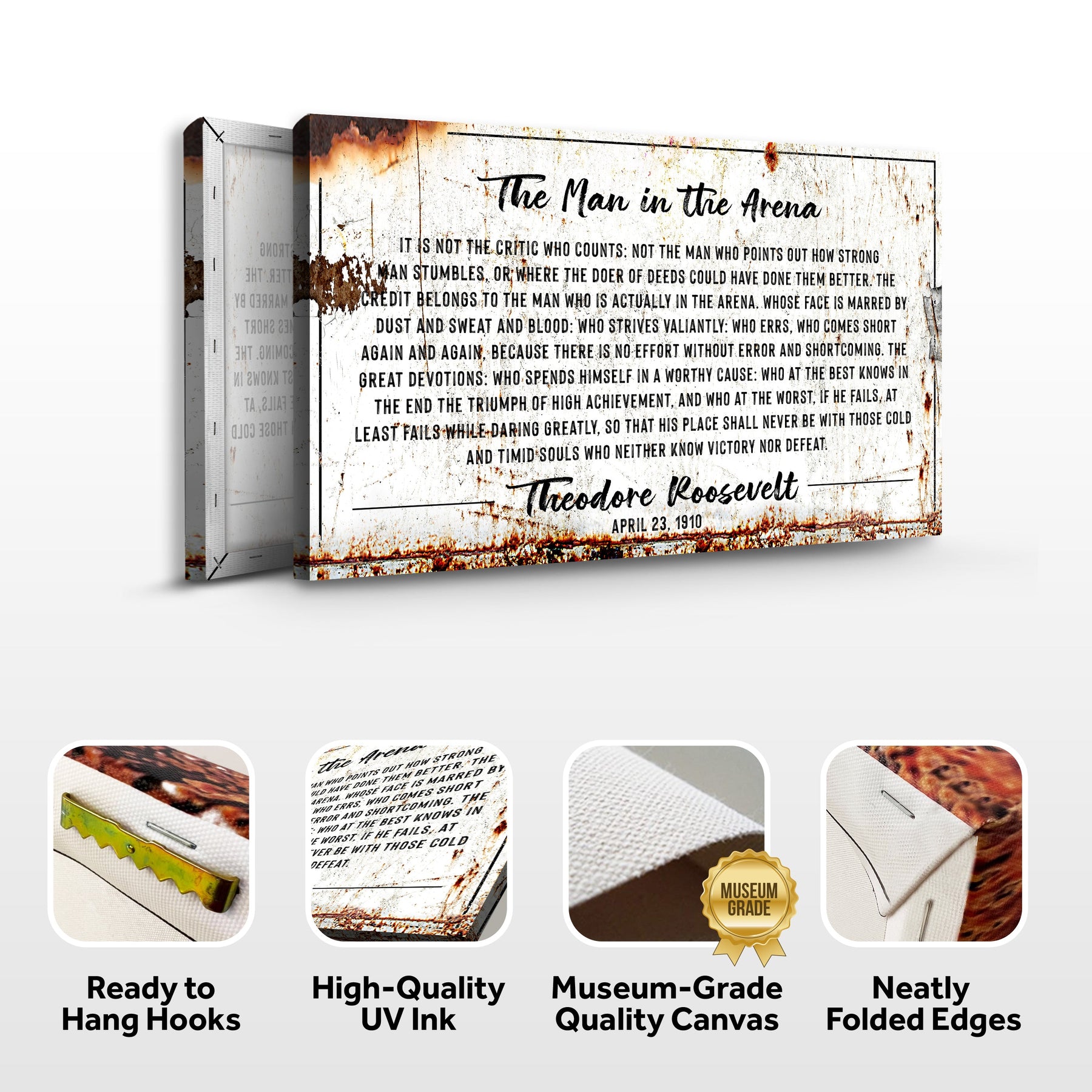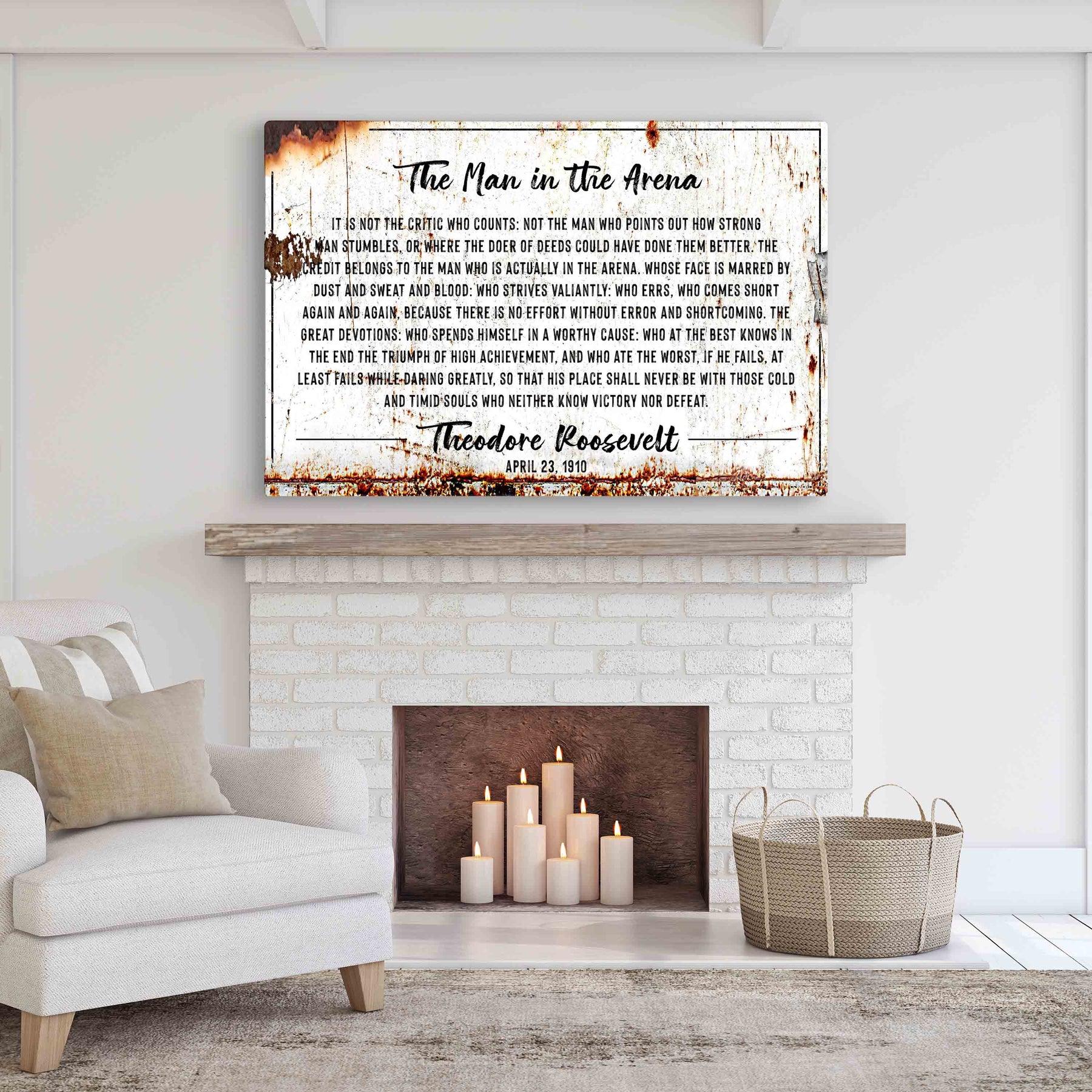 Highlight your vintage-themed interior with this rustic The Man in The Arena sign on your wall. This canvas wall art is perfect for hanging in the living room, as this great inspiring message from Theodore Roosevelt will brighten up your living room space!