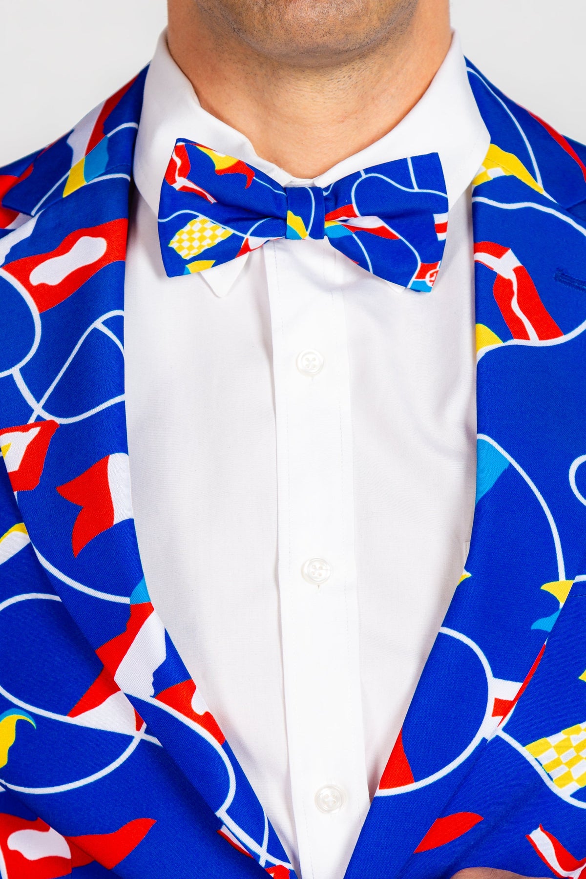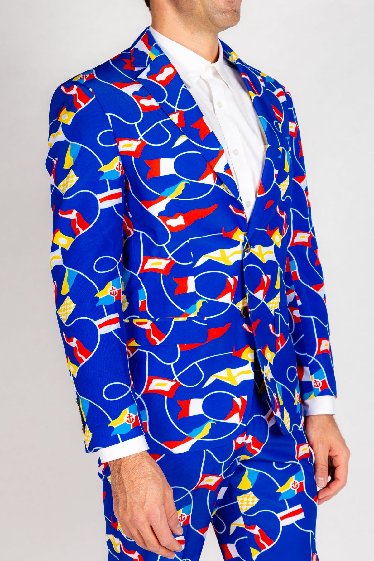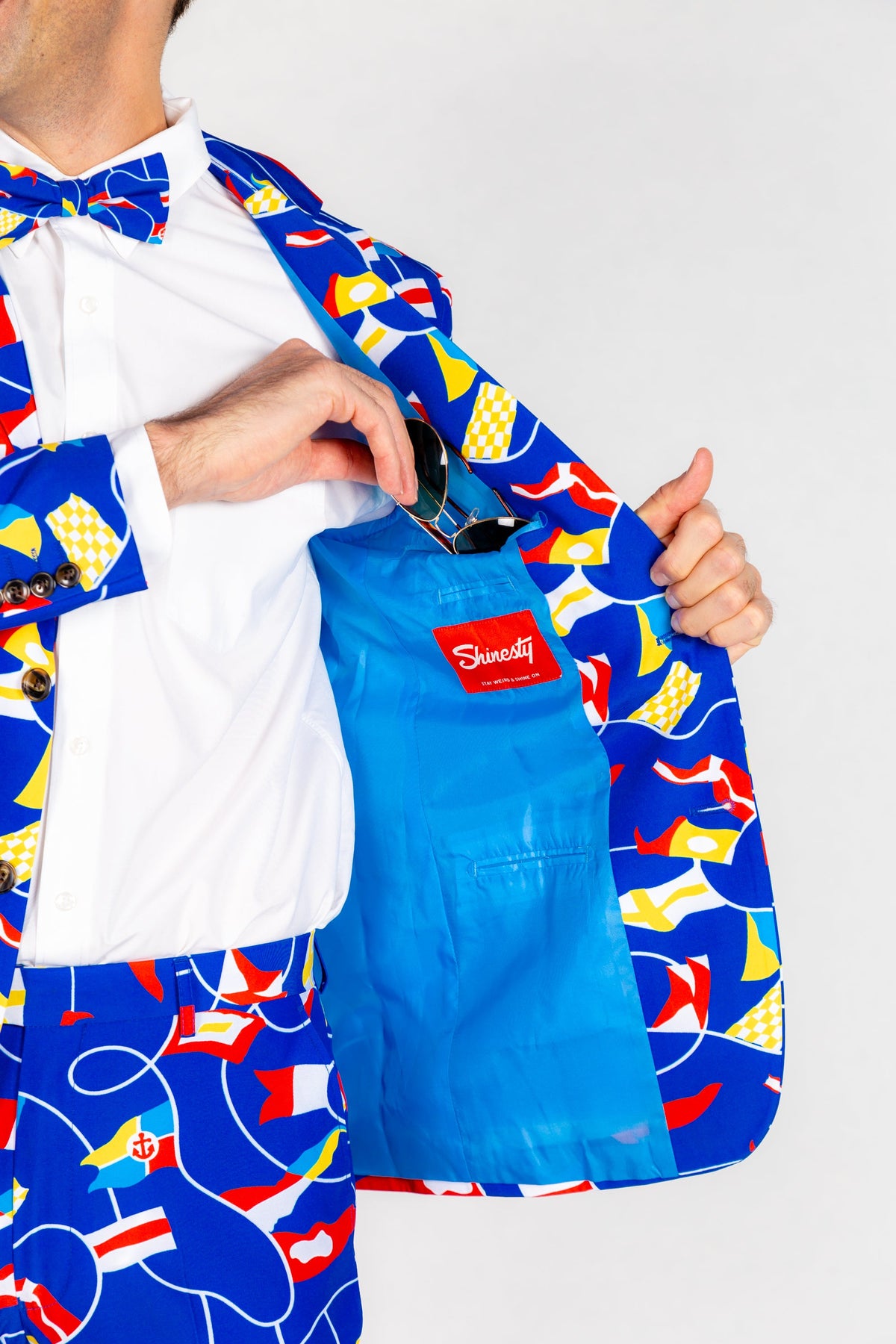 Who's ready to go yachting? I know I am. This nautical party blazer will have you feelin' like setting sail on the deep blue sea, even if you don't know anyone with a boat. You'll make it happen when you slip on this blue nautical men's suit jacket.