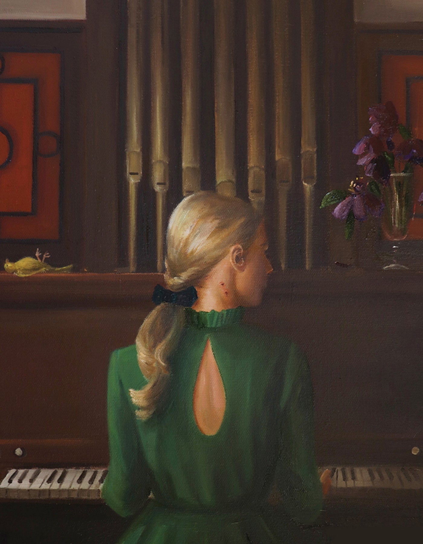 Vampire fangs adorn the neck of a mysterious woman playing the piano.